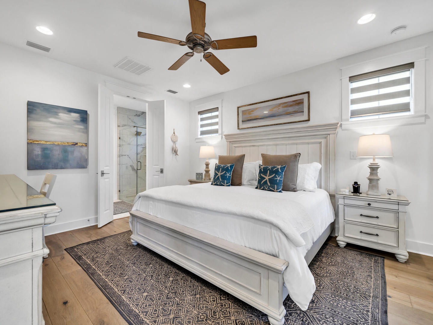 On the first floor, ground level, you'll find the master bedroom, which features a king-size bed, walk-in shower, and views to the porch and pool! Coastal beach decor and light/inviting colors really make the master bedroom a wonderful retreat.
