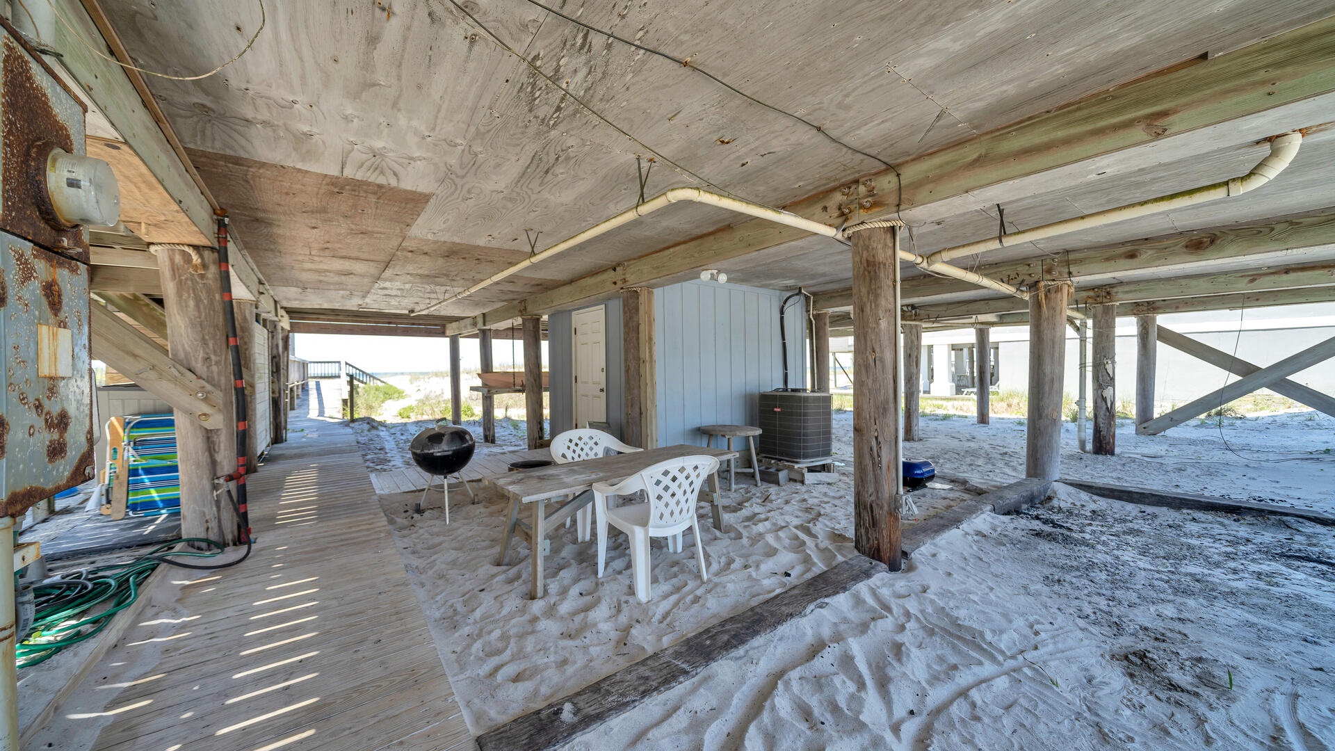 Underneath the home, you'll find a nicely shaded area with beach gear, sitting table, lounge chairs, beach gear, enclosed outdoor shower, and a charcoal grill! From here, the wooden walkway leads out to the beach, allowing for easy access to beach or home with just a couple steps at the beach end!