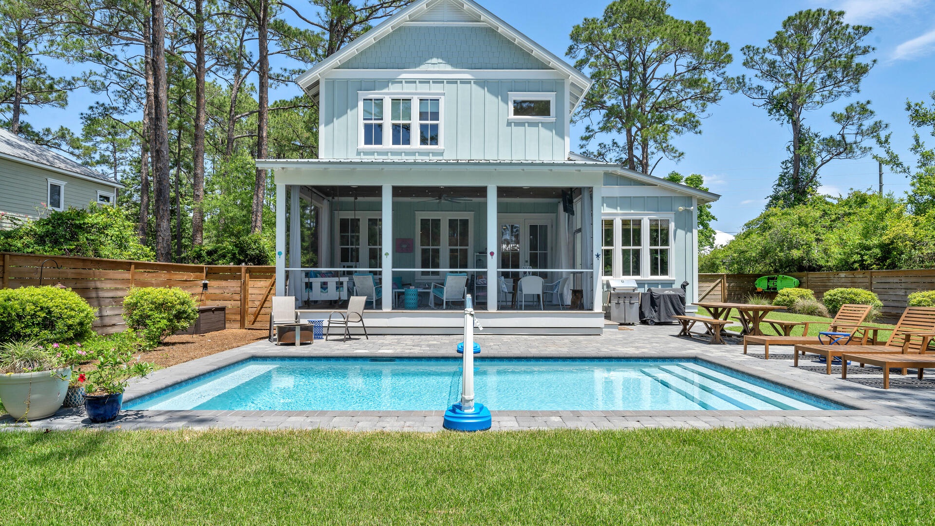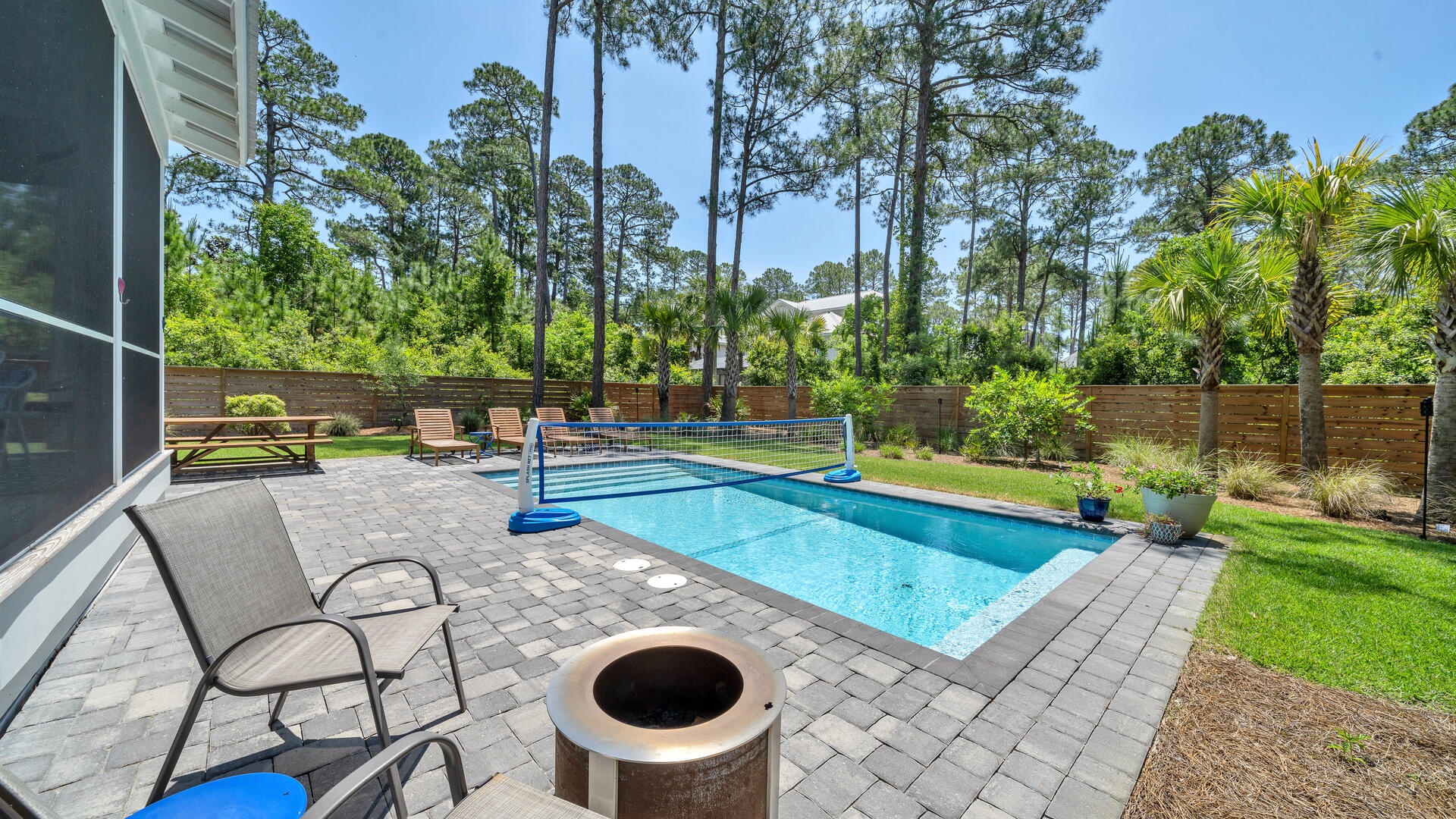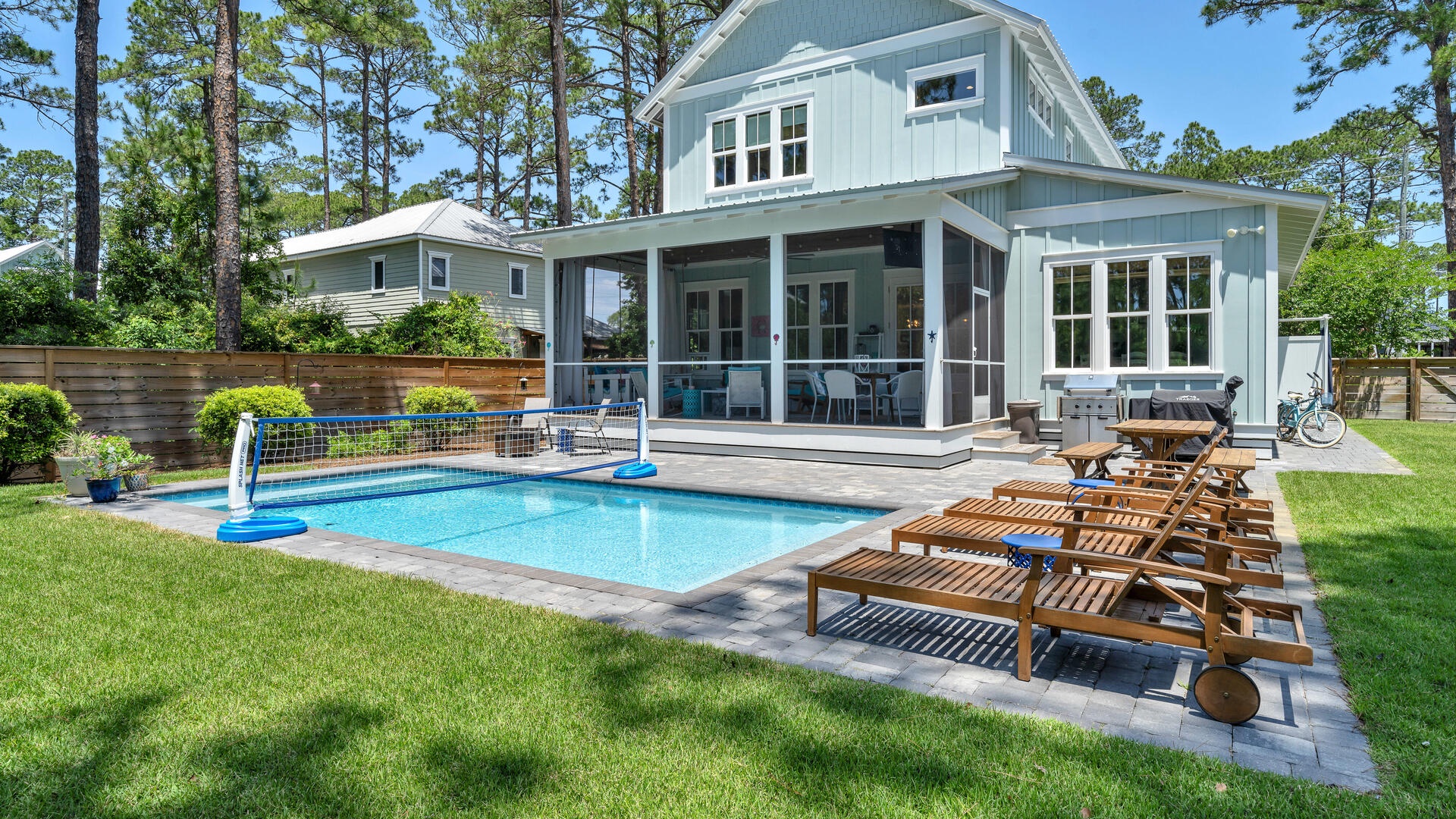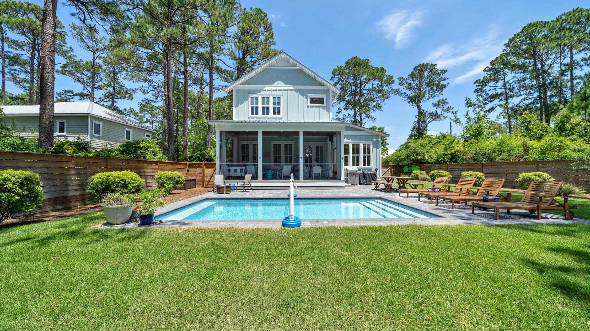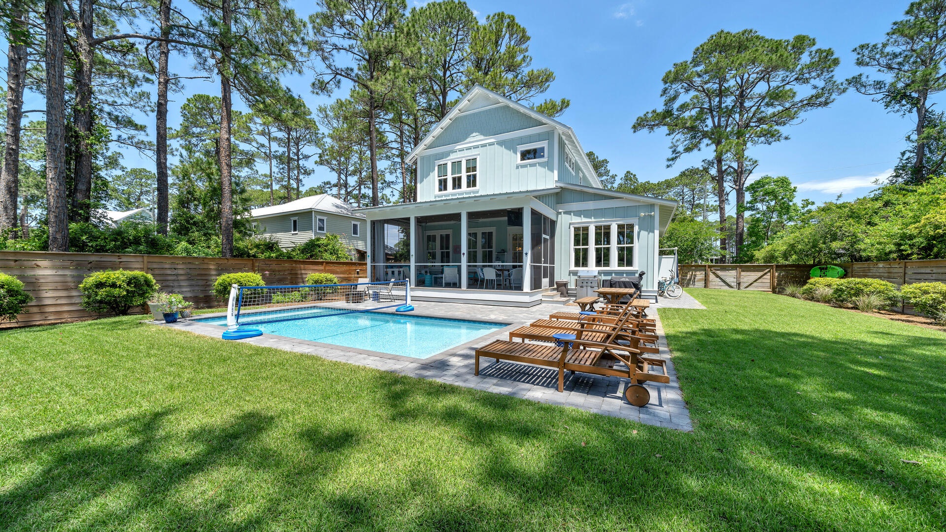With one of the most relaxing, spacious and downright wonderful back yards in the area, you'll absolutely love the feeling of seclusion. Returning from the beach, you're able to access the gated yard alongside the house, with the first convenient stop being a fantastic outside shower! In addition to the huge yard, beautiful swaying pines, private pool, sun-deck, and screen room, there's a grilling space with 4-burner grill, large farm-style family dining table, and even a small fire pit for s'mores!