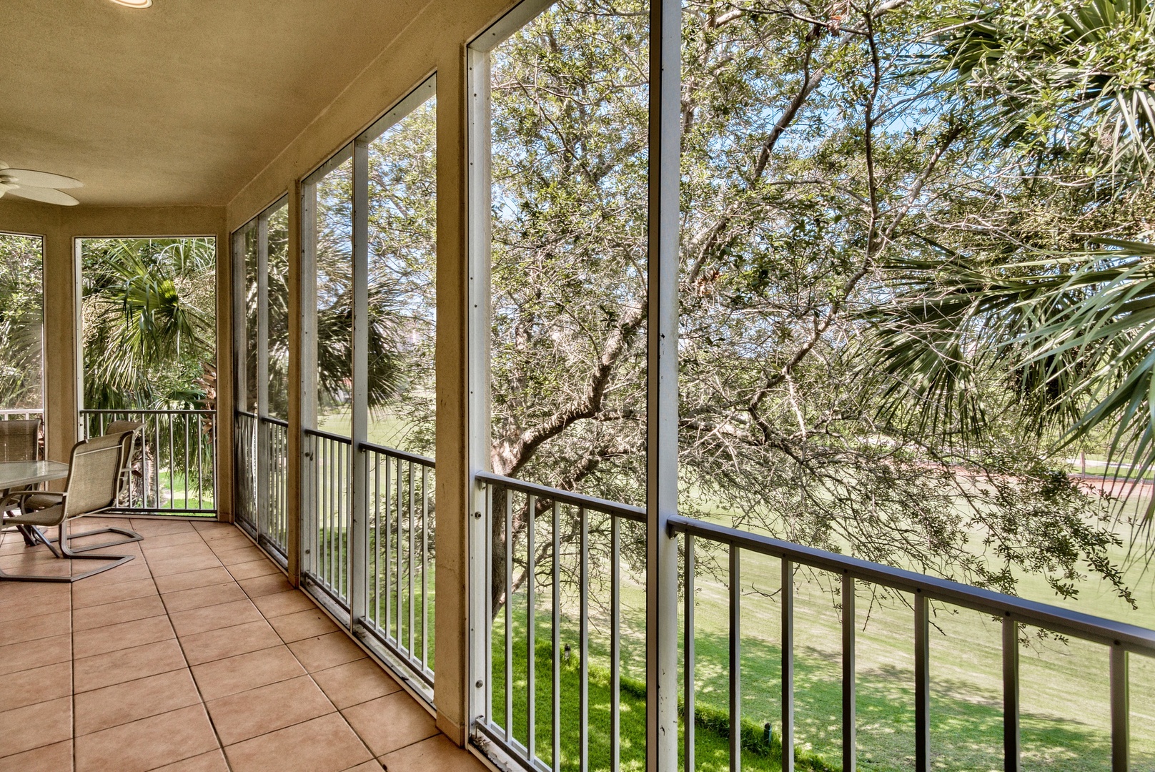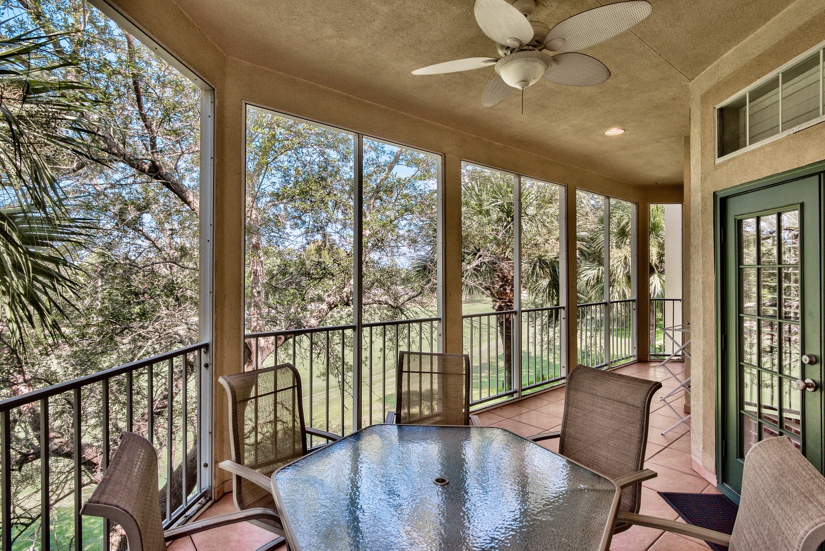 Whether you're enjoying a morning coffee, or sipping an evening cocktail, the wrap-around screened-in porch is the place to be! From the beautiful second-floor location, you'll love the warm breezes blowing up from the Gulf of Mexico. It's the perfect place for reading, relaxing, conversation, or just gazing through the shade-trees to watch the golfers work their way down the fairway, which runs directly in front of the building.