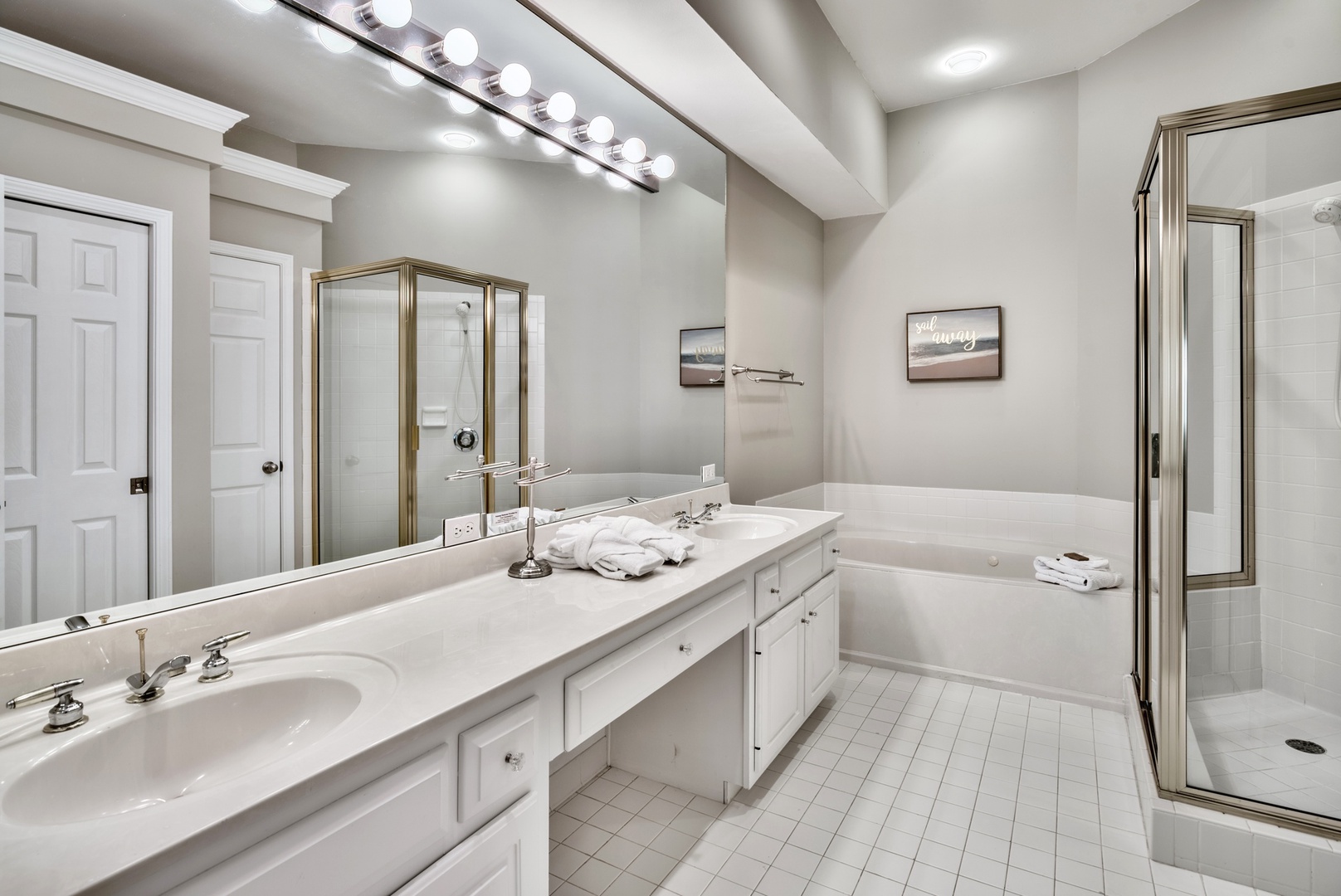 The master bath with dual vanities, soaking tub, and walk-in shower!