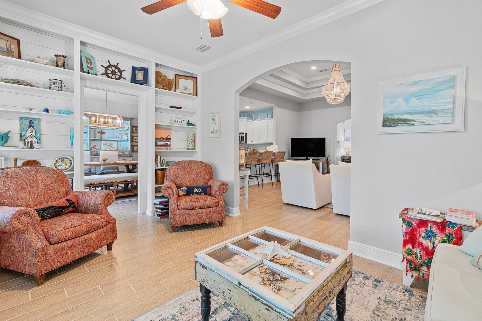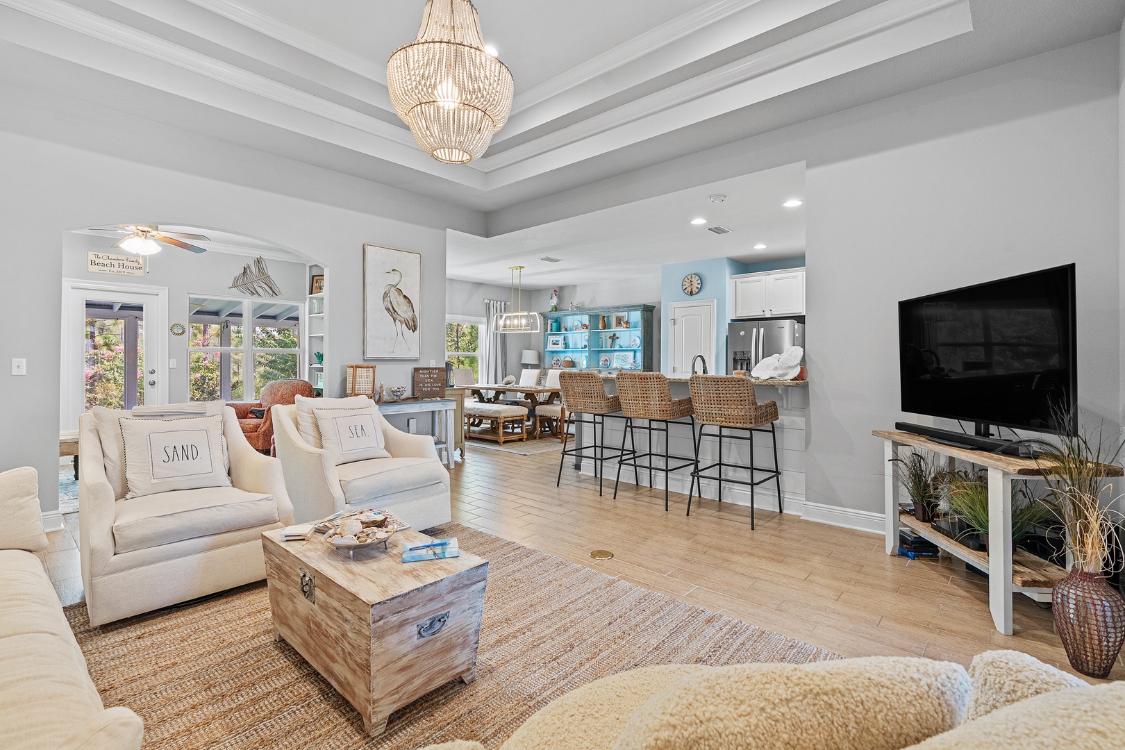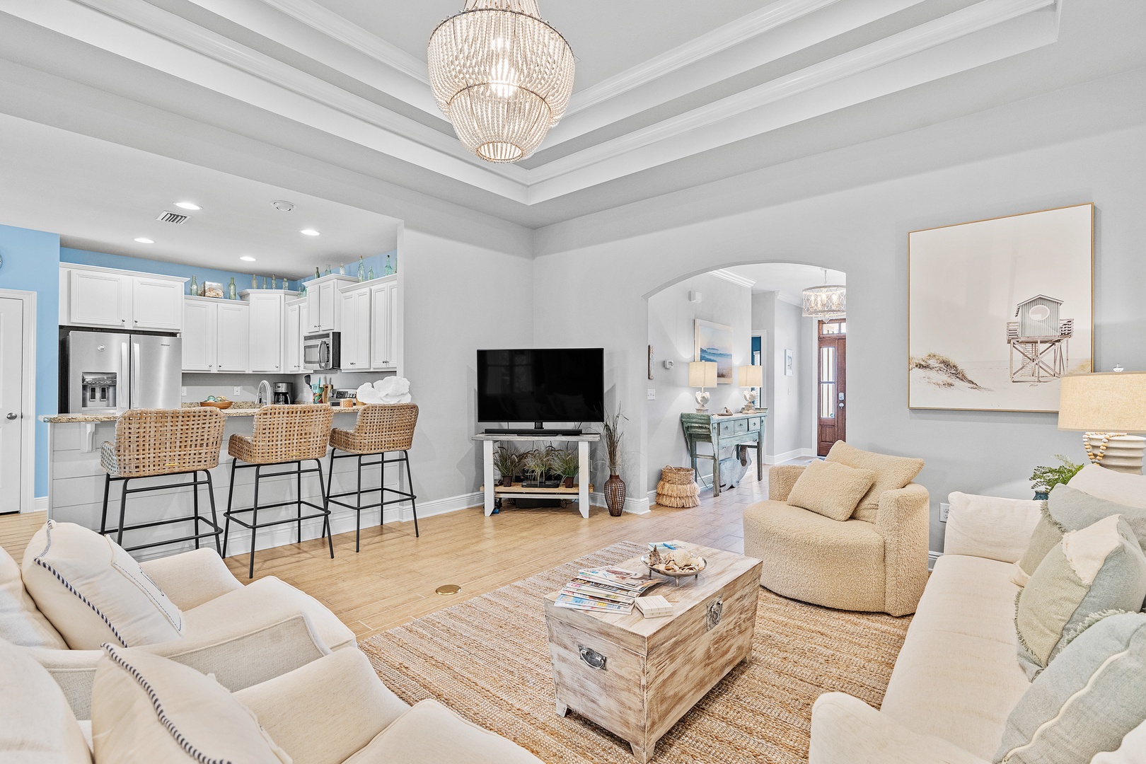 - Multiple living spaces, beautiful coastal decor