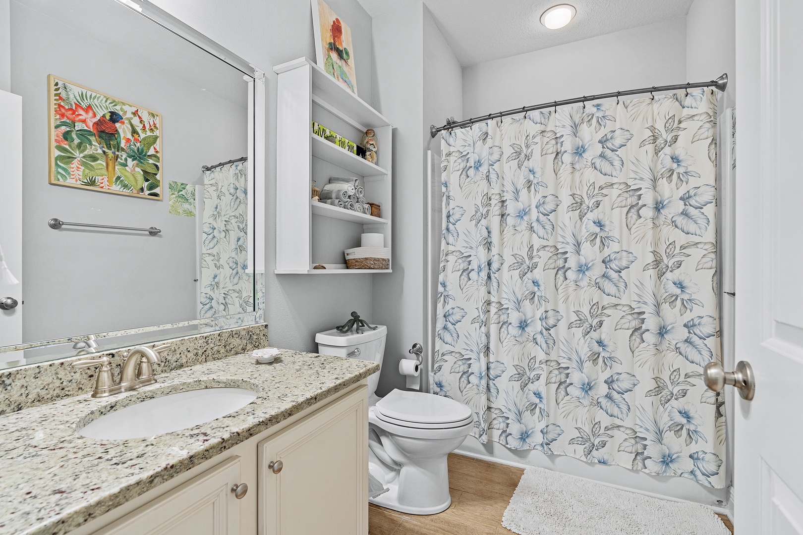 The guest bathroom includes a tub-shower combo!