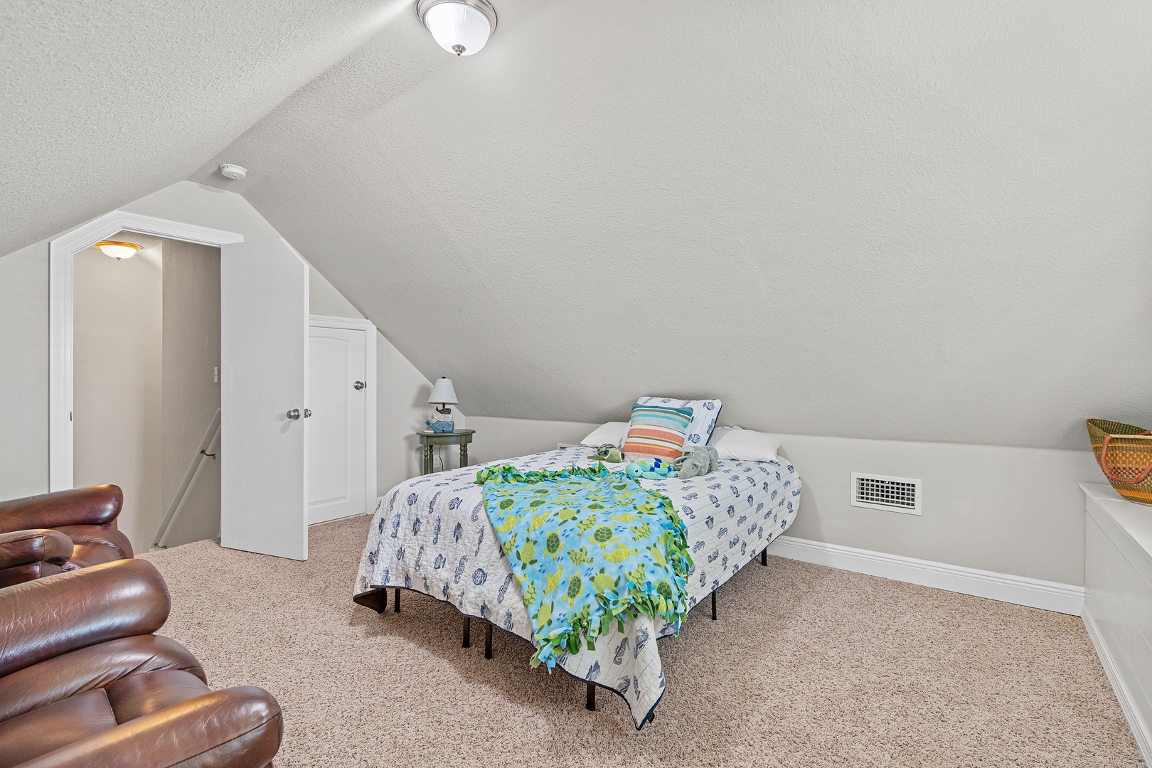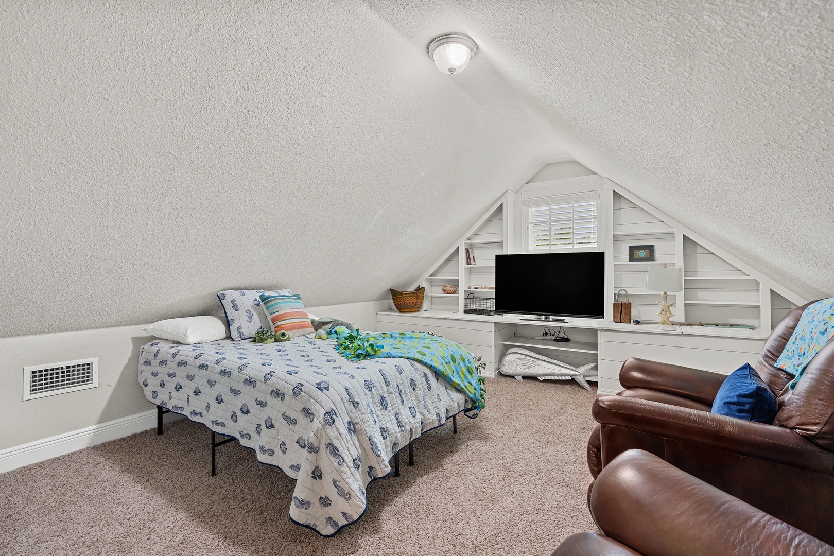 The loft includes a full bed, flat screen TV and leather lounge chairs!