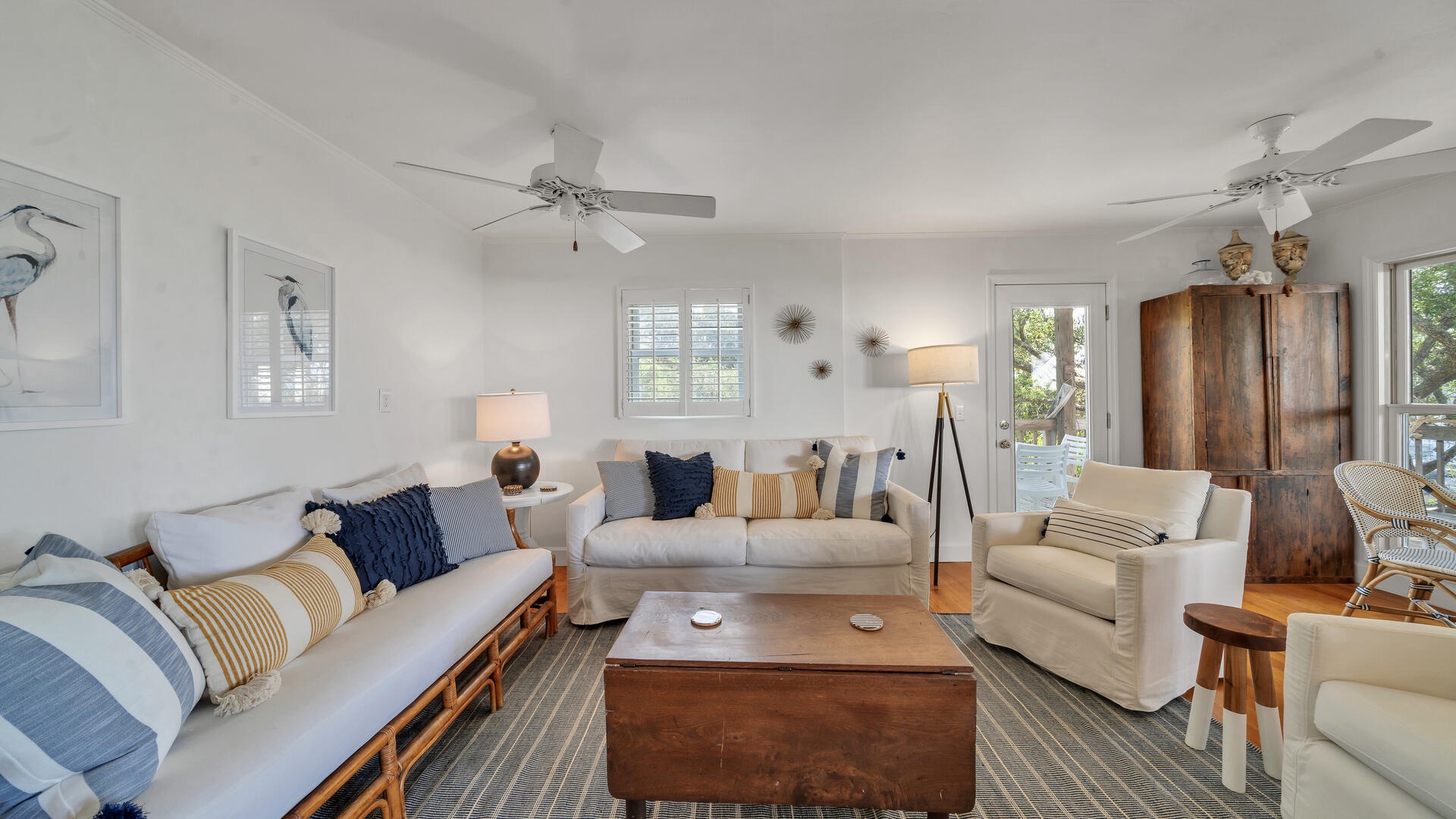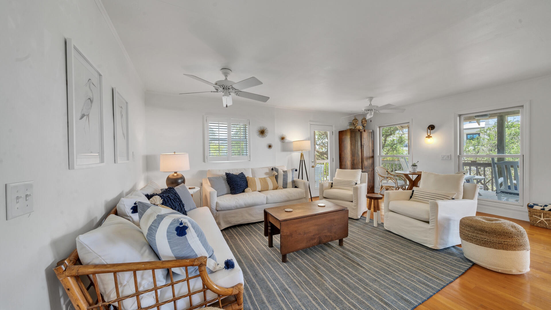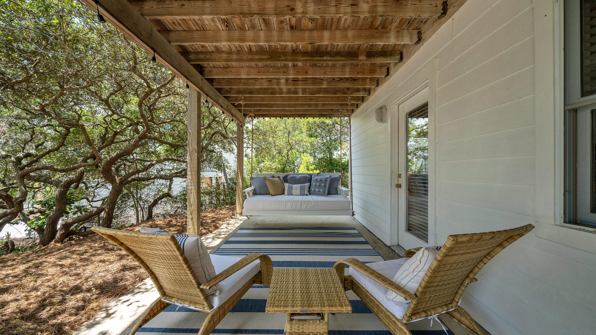 On the main level, a wrap-around covered deck offers up two hammocks, multiple rocking chairs and sitting chairs, as well as an outdoor dining space! With the shade of the surrounding live oak trees, and the coastal breezes, you'll find yourself falling in love with the outdoor spaces!