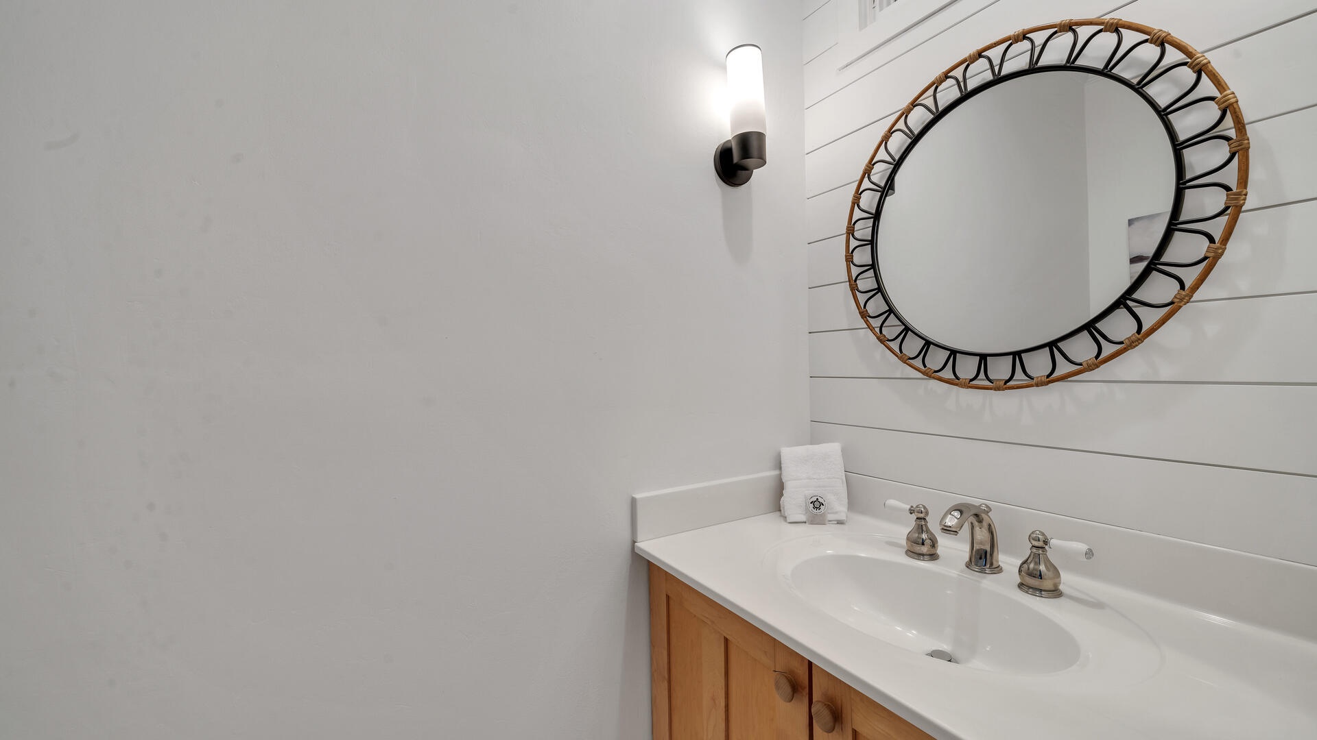 The home includes two bathrooms (a full bathroom on the bedroom level and a half-bath on the main living space level, plus the private outdoor shower).