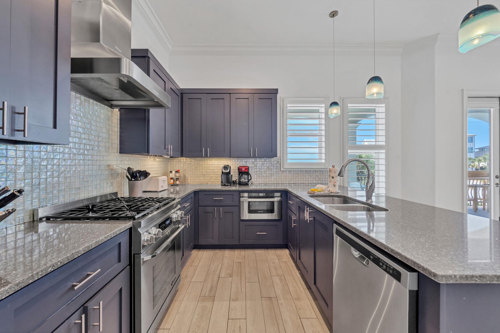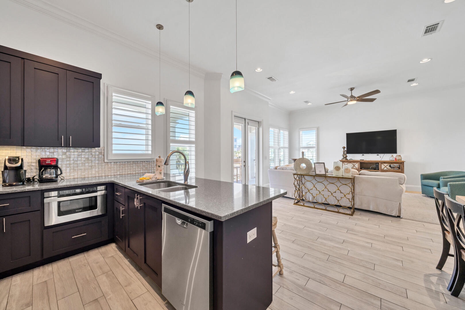You'll love the open plan kitchen-living-dining area, which features a wall of windows embracing the beaches and Gulf. Light and bright interiors are tastefully decorated with vivid colors and elegant design pieces. The dining area features a solid wood table for family gatherings, and the adjacent kitchen offers stainless steel appliances, quartz countertops, and everything you could want or need to prepare a gourmet meal!