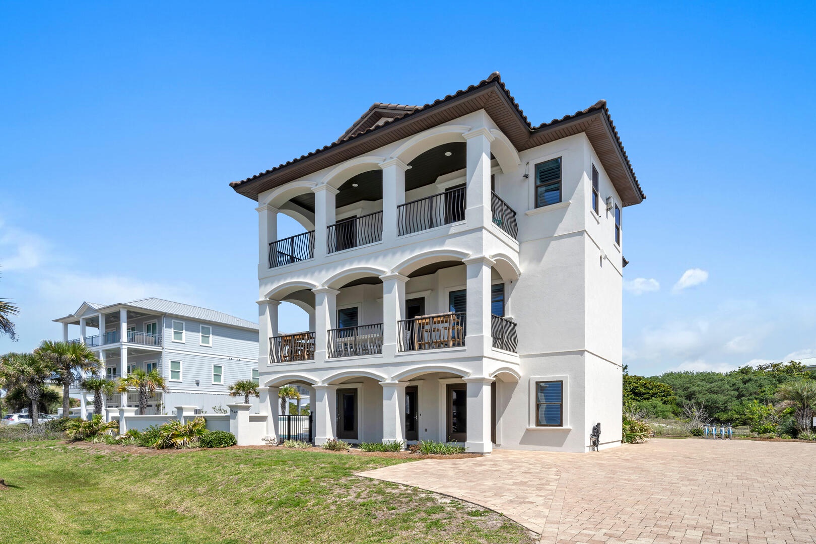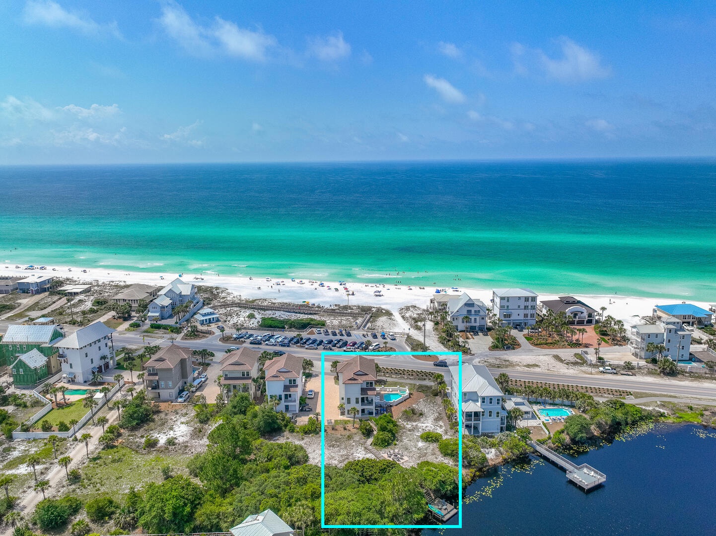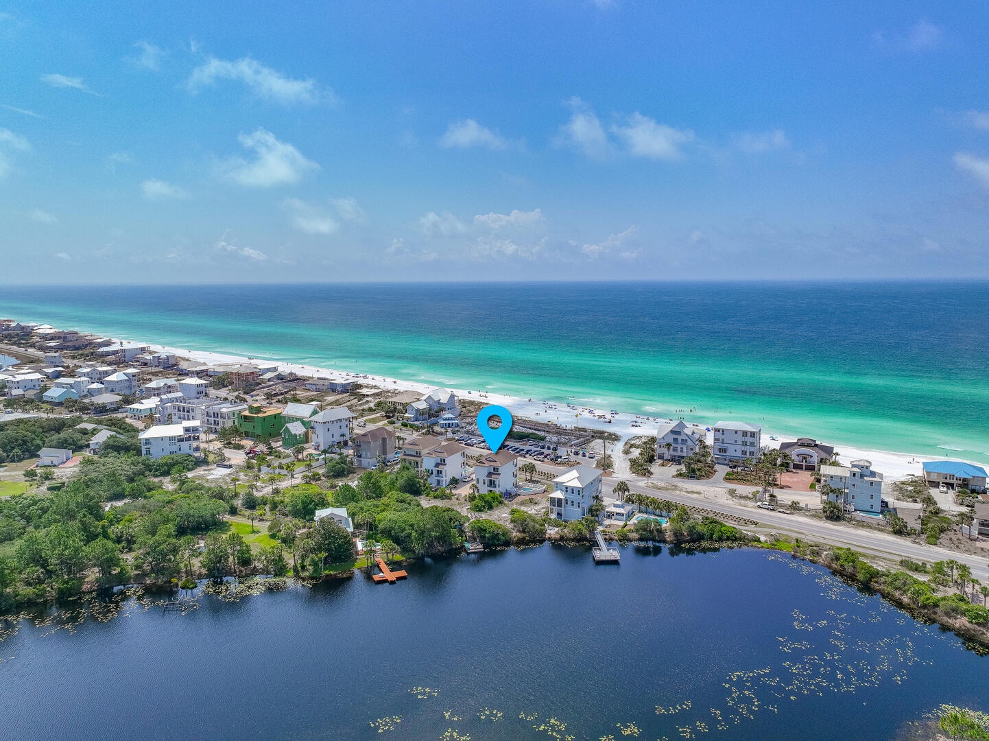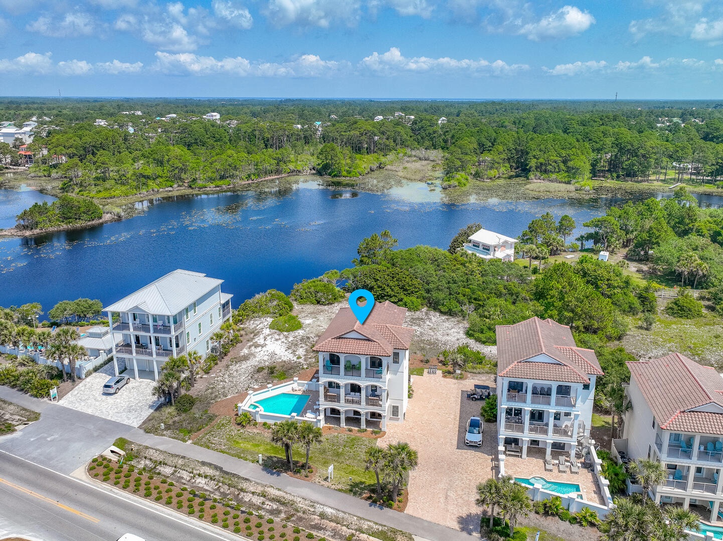 This gorgeous 6 bedroom home features coastal contemporary design, sweeping views of the beach and Gulf of Mexico, a private pool/spa, cruiser bikes, fire pit patio, and your own private dock for paddling and kayaking on the lake directly behind the home!