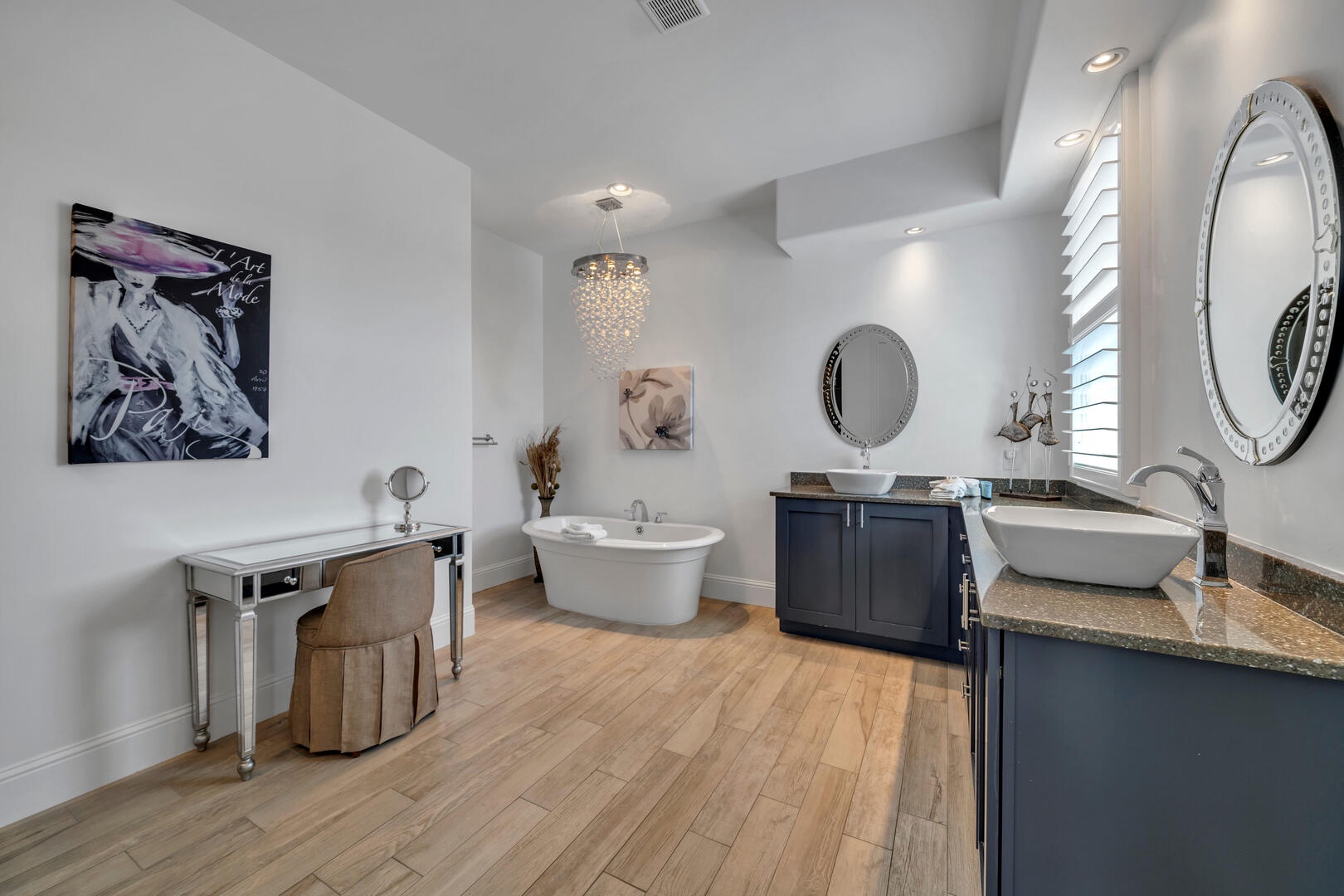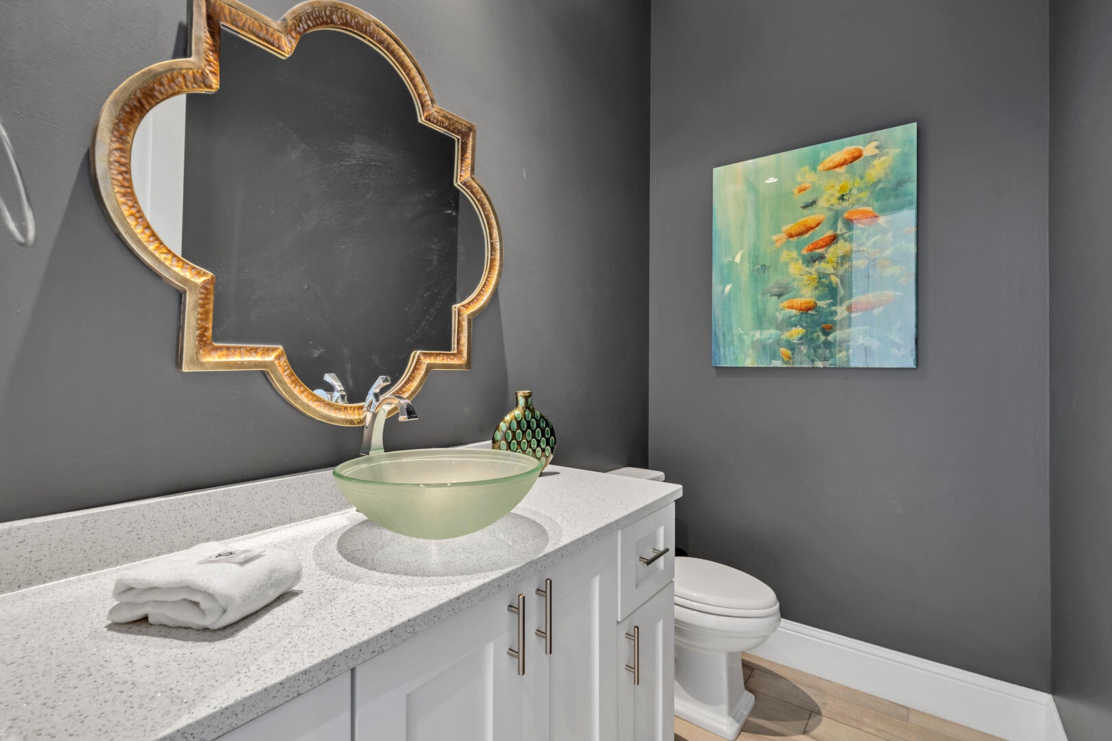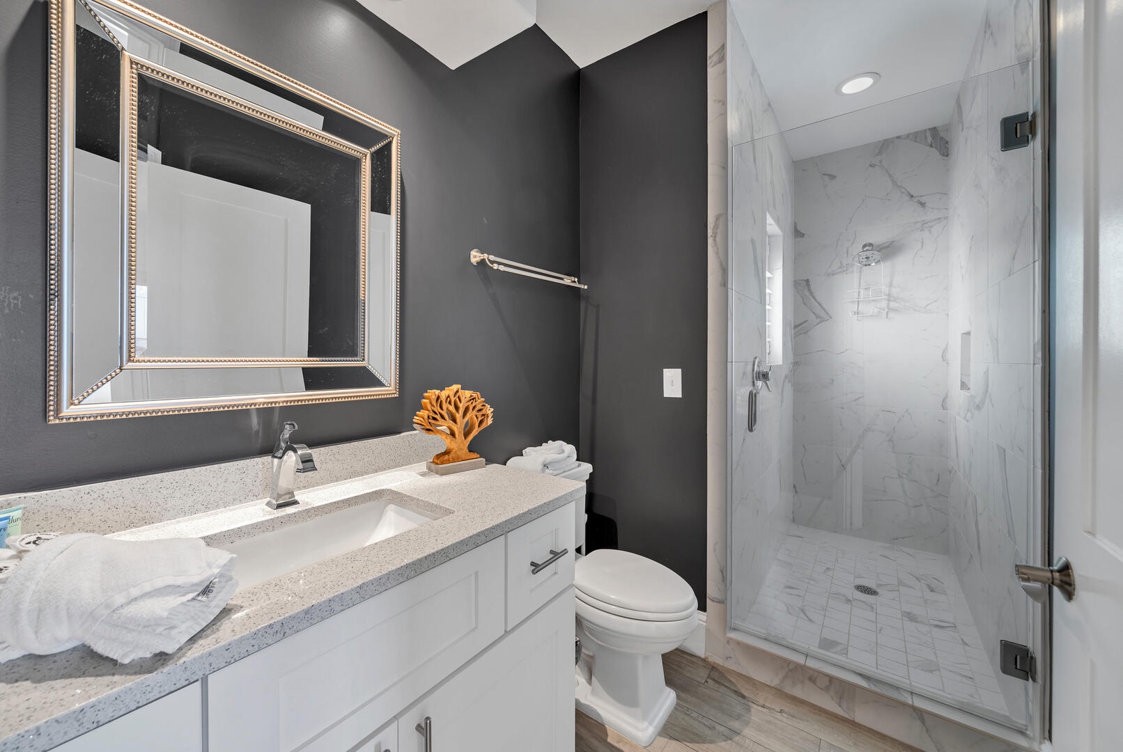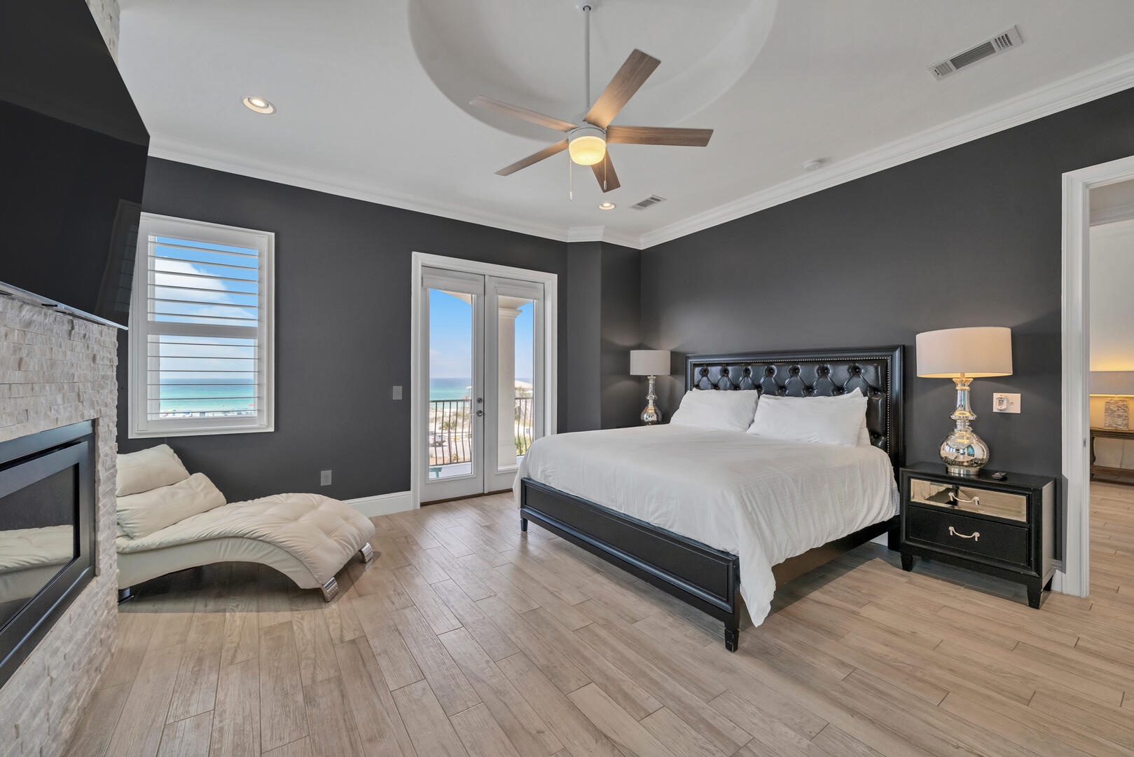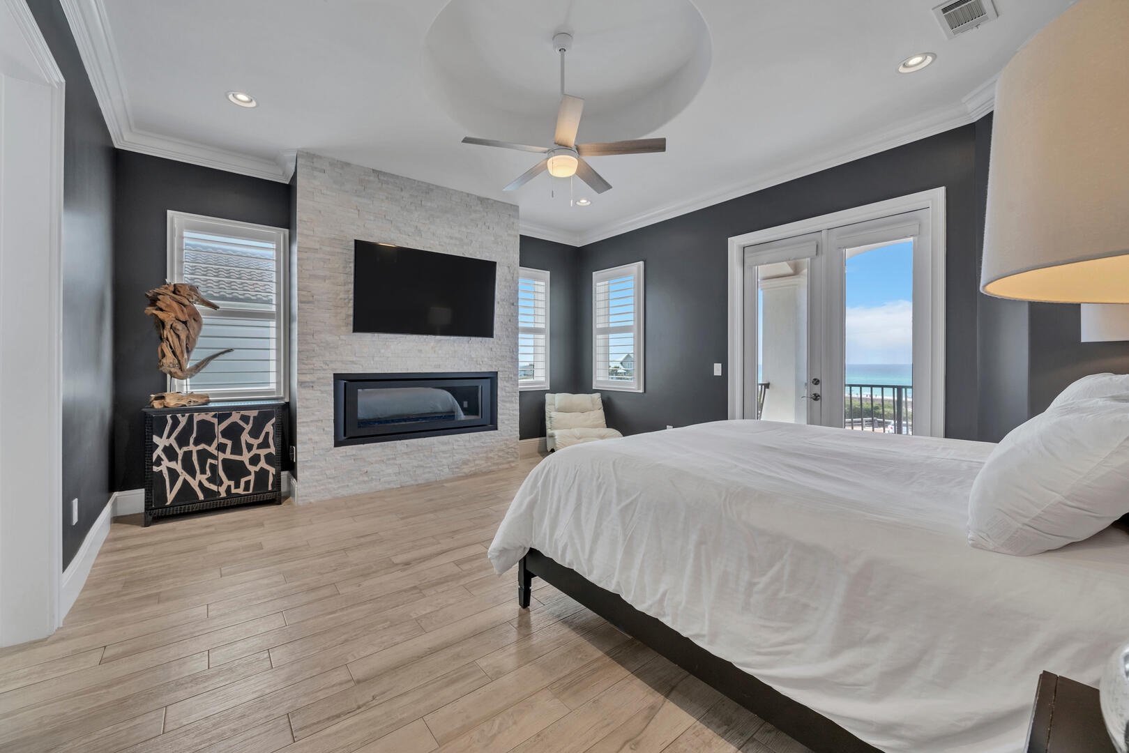 With bedding provided for up to 16 guests, every room at 30A Morning Surf is well appointed with coastal contemporary design accents throughout. Each bedroom features a private bathroom with individualized design accents and tile work. The master suite is located on the third floor and is simply amazing, featuring a king size bed, expansive gulf views, private balcony, fireplace, and a private bathroom so large it is a suite in and of itself!
