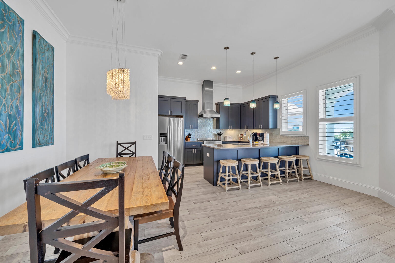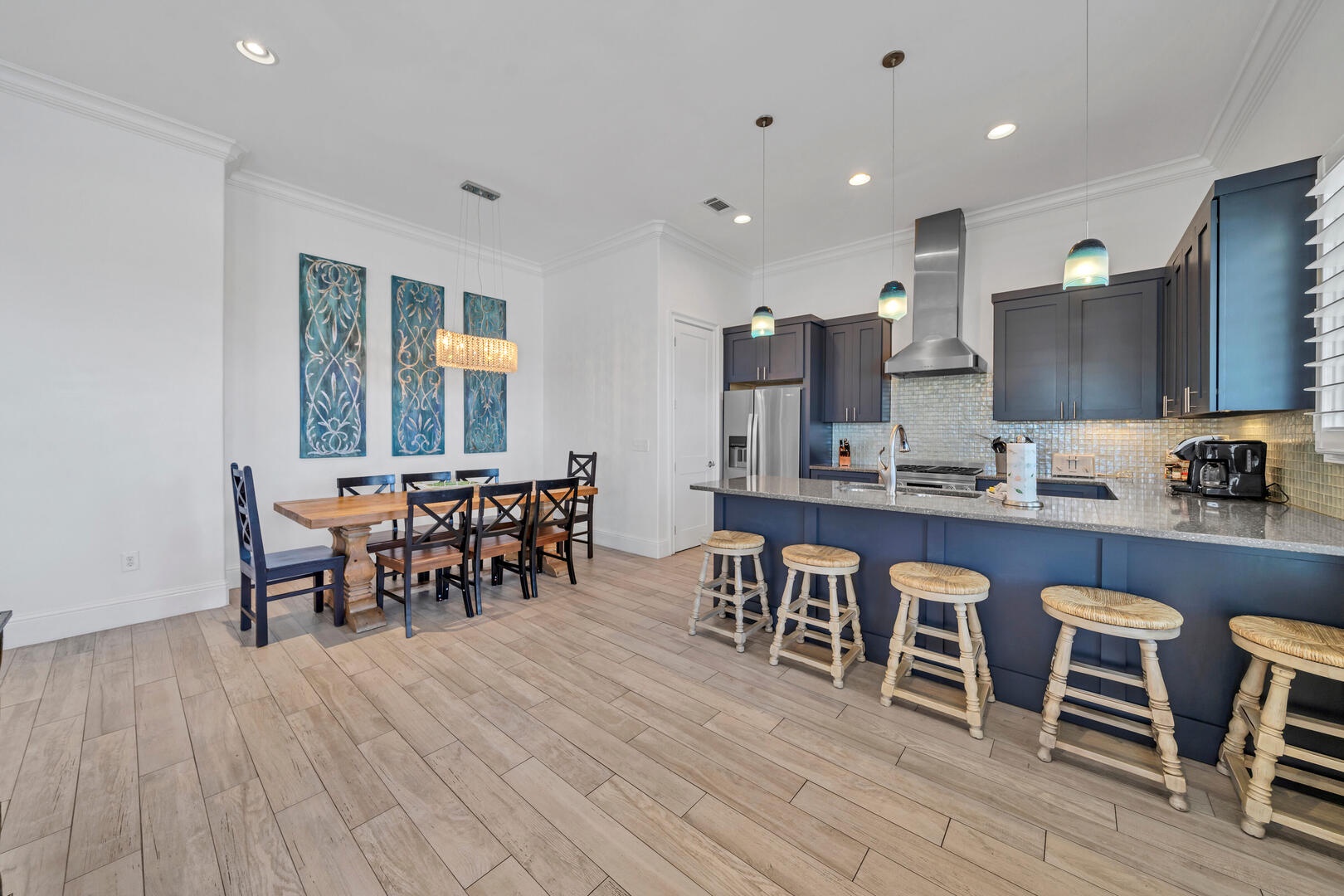 The dining area offers seating for 8, +10 at the breakfast bar and balcony!