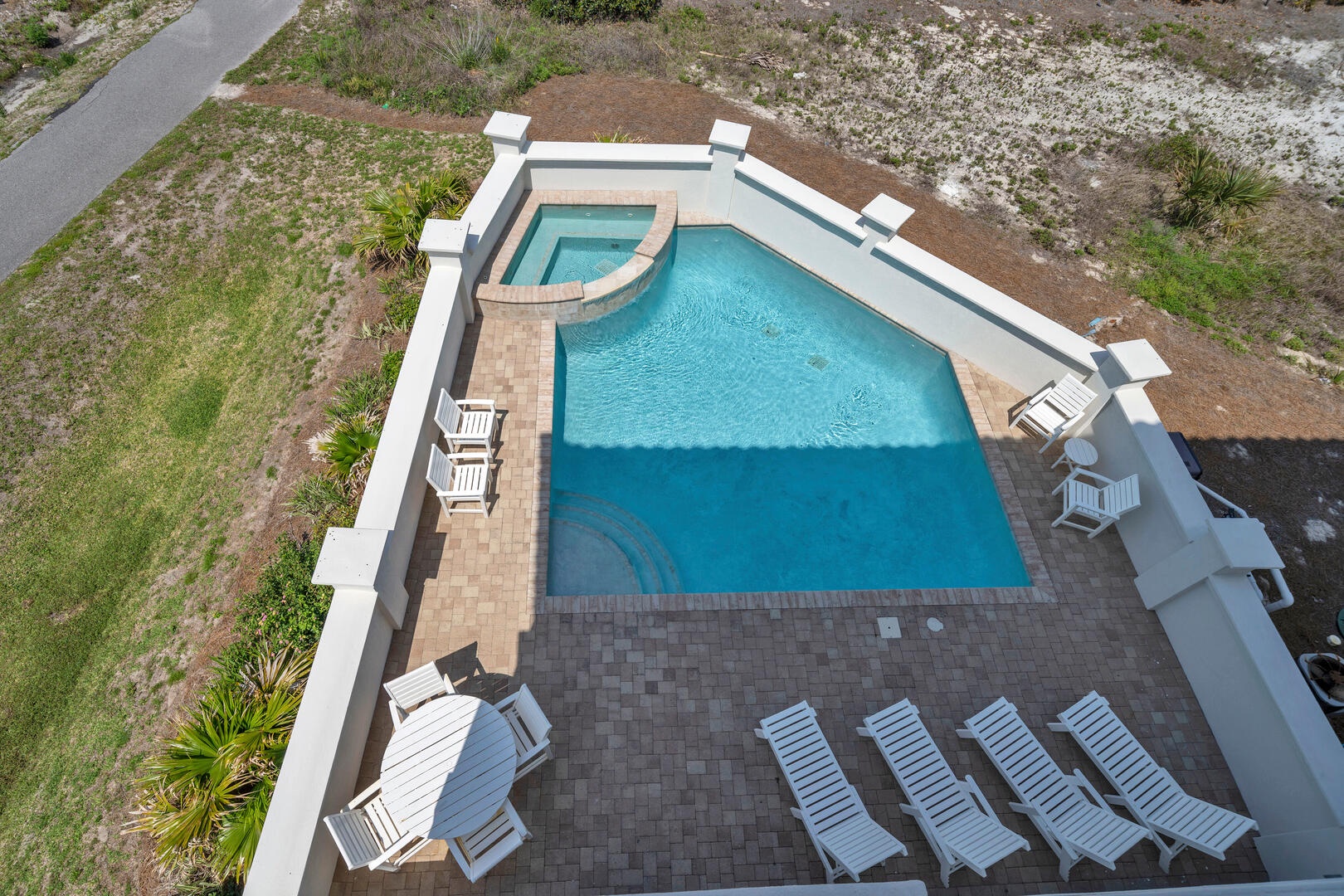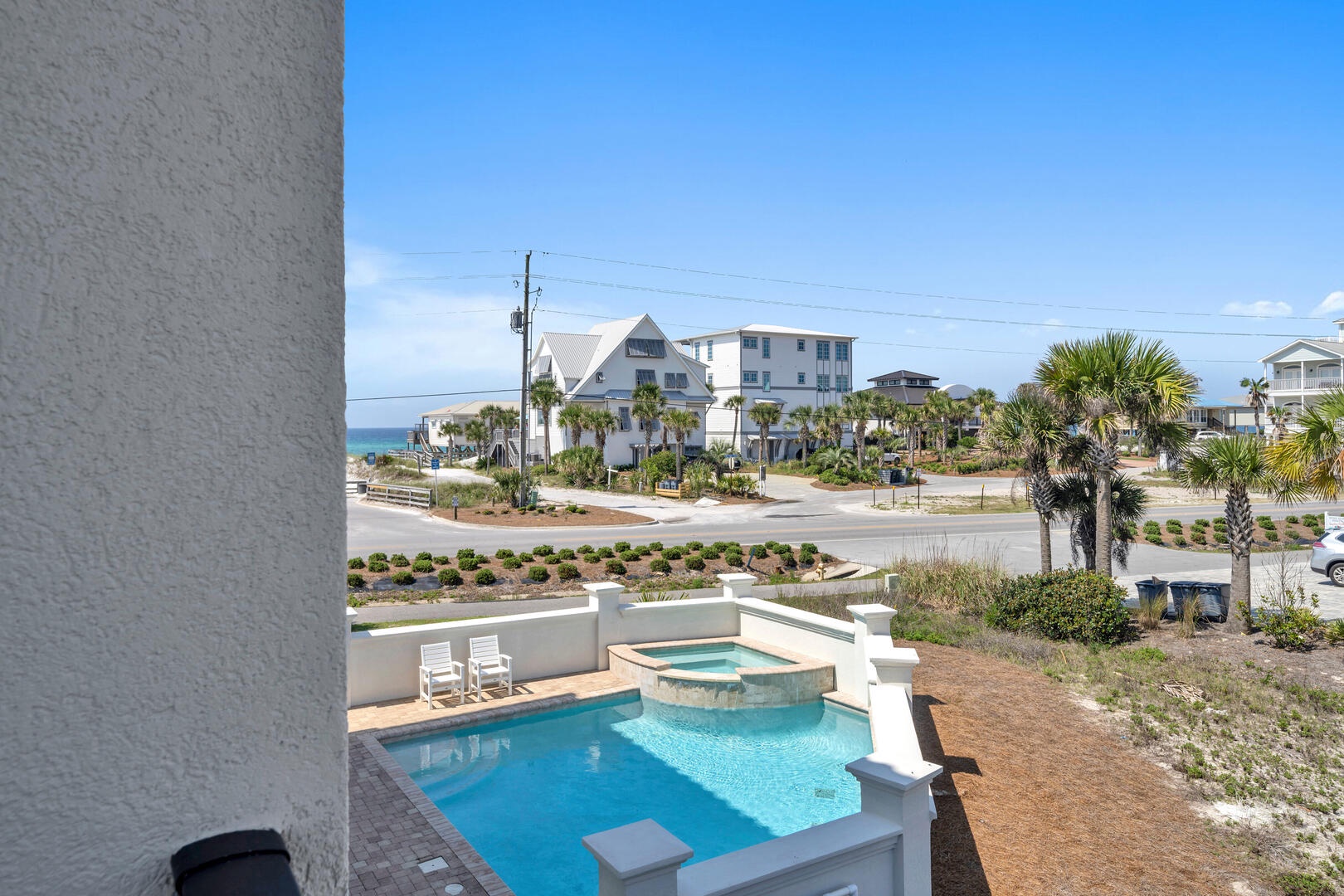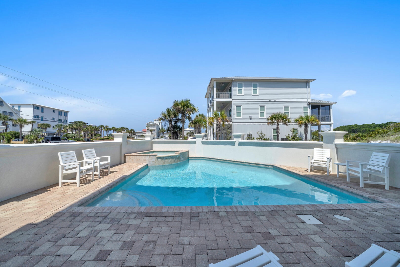 In addition to the wonderful location, views and natural beauty of 30A Morning Surf, you'll also love the private pool and spa. The pool is large, featuring several several sparkling wall fountains, and a spa for relaxing and soaking. There’s also plenty of space for sunning and grilling. The beach access is directly in front of the home, just across Scenic 30A.