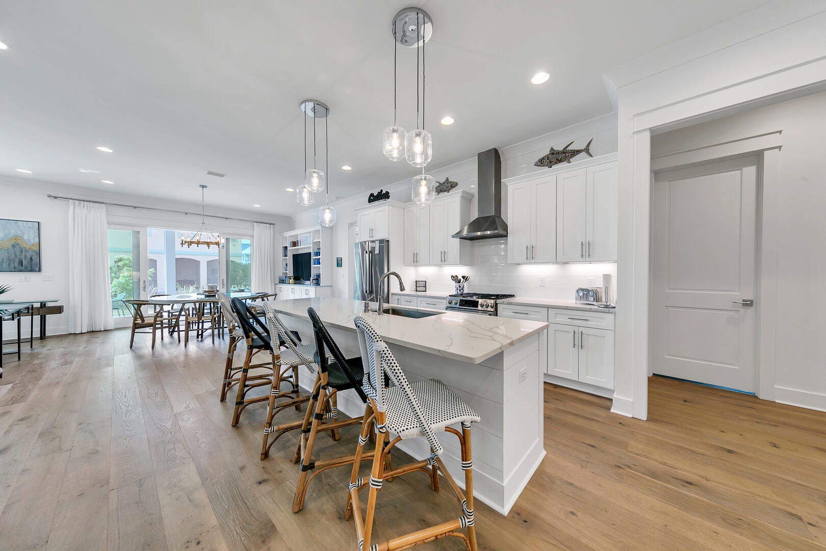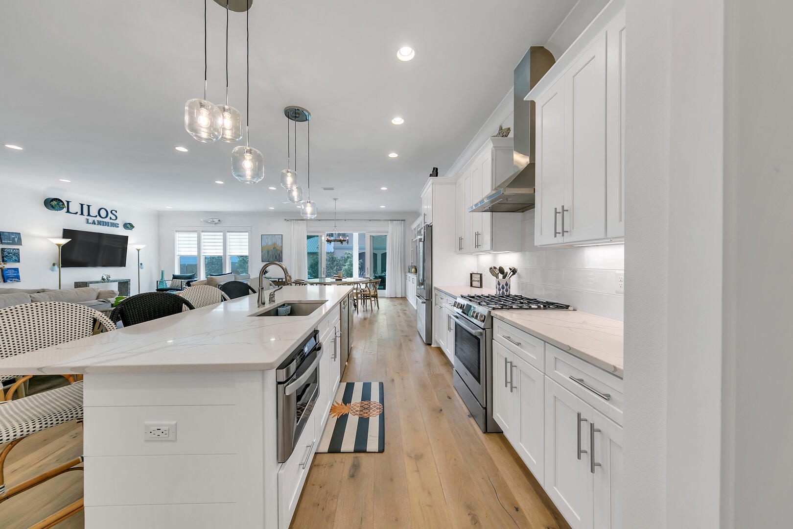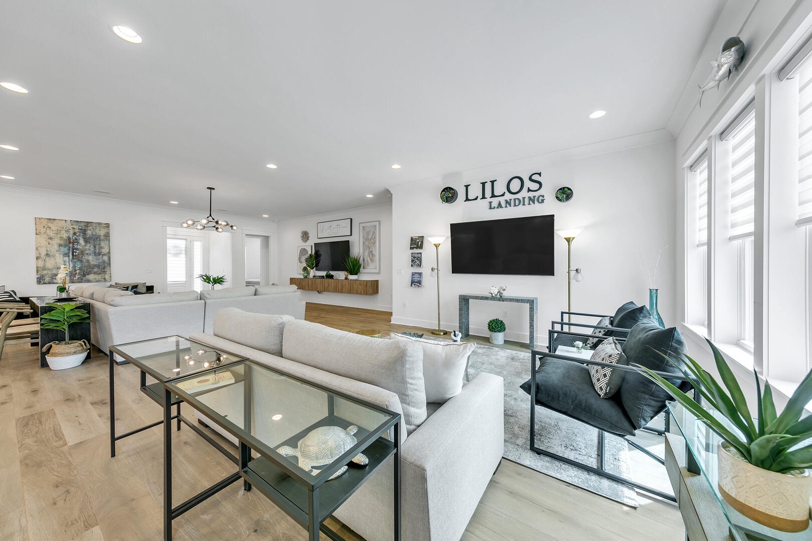 The main living space features an open-plan kitchen-living-dining area. You'll find a large living room with plush, wraparound sofa and huge flat screen TV for movie nights! There's a second sitting area with additional flat screen, and a nicely outfitted dining space as well! Additional seating can be found at the breakfast bar, or the outdoor bistro table. The kitchen is large, bright, modern and adorned with coastal contemporary finishes. You'll find every drawer and cabinet well-equipped with everything you could want for preparing wonderful family meals!