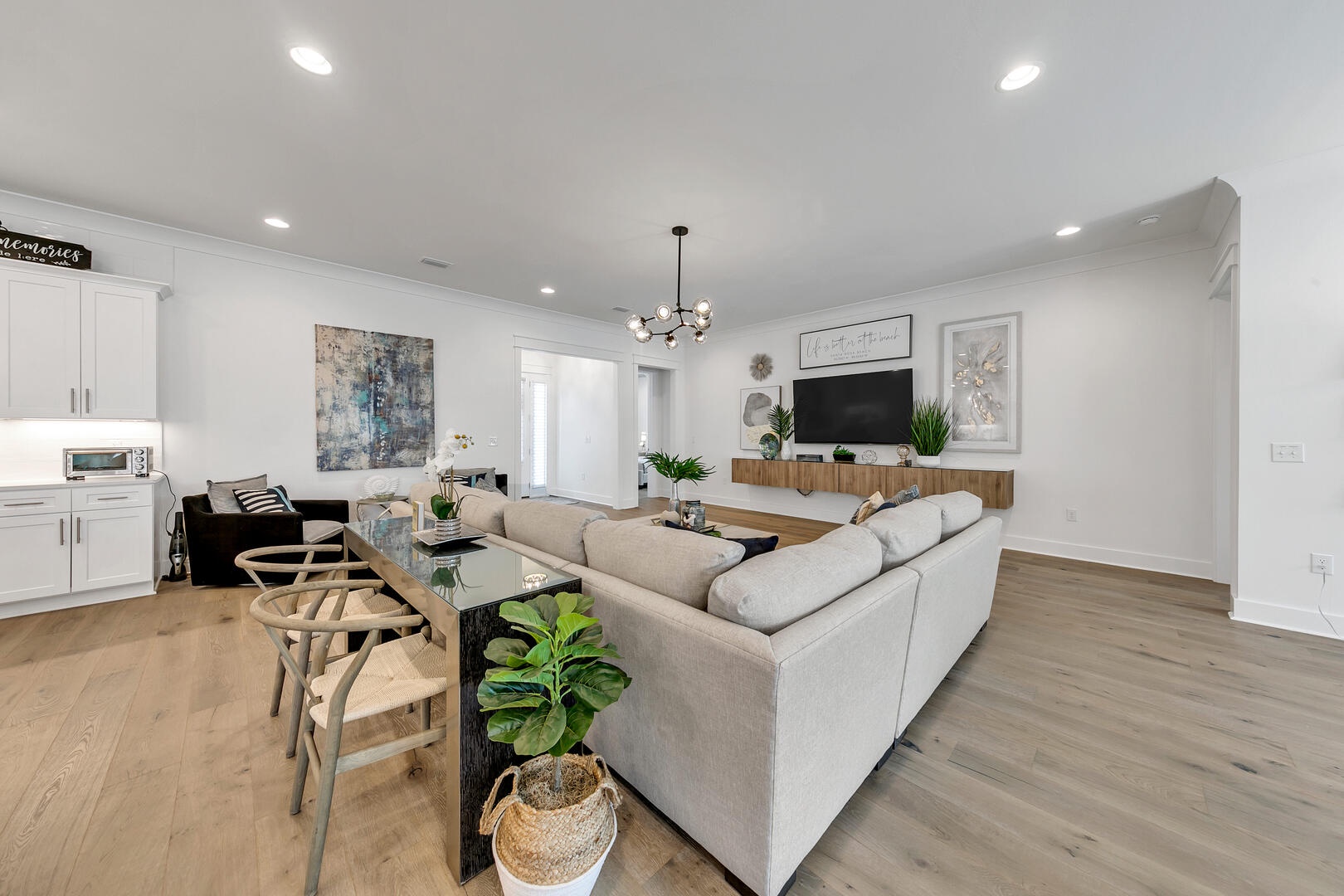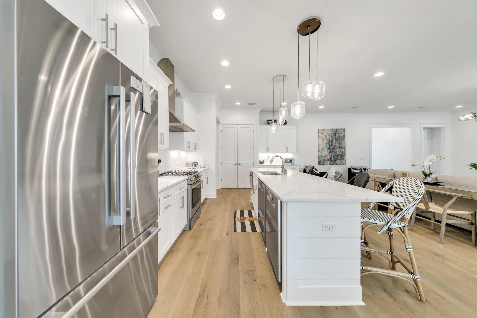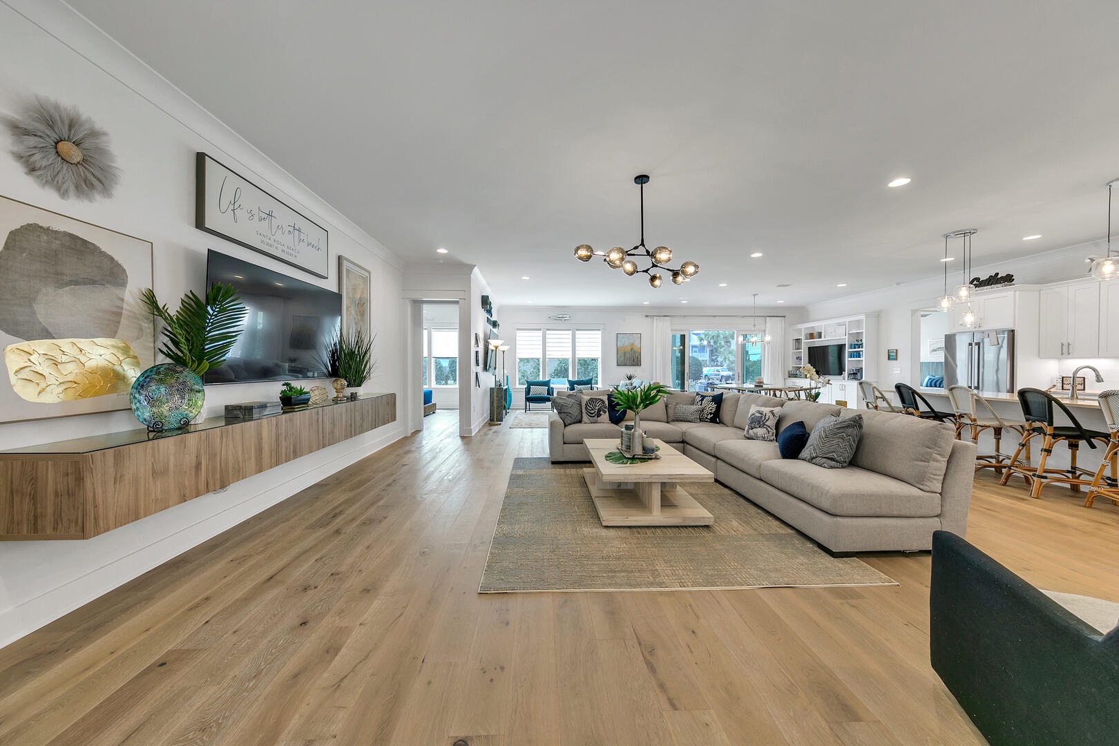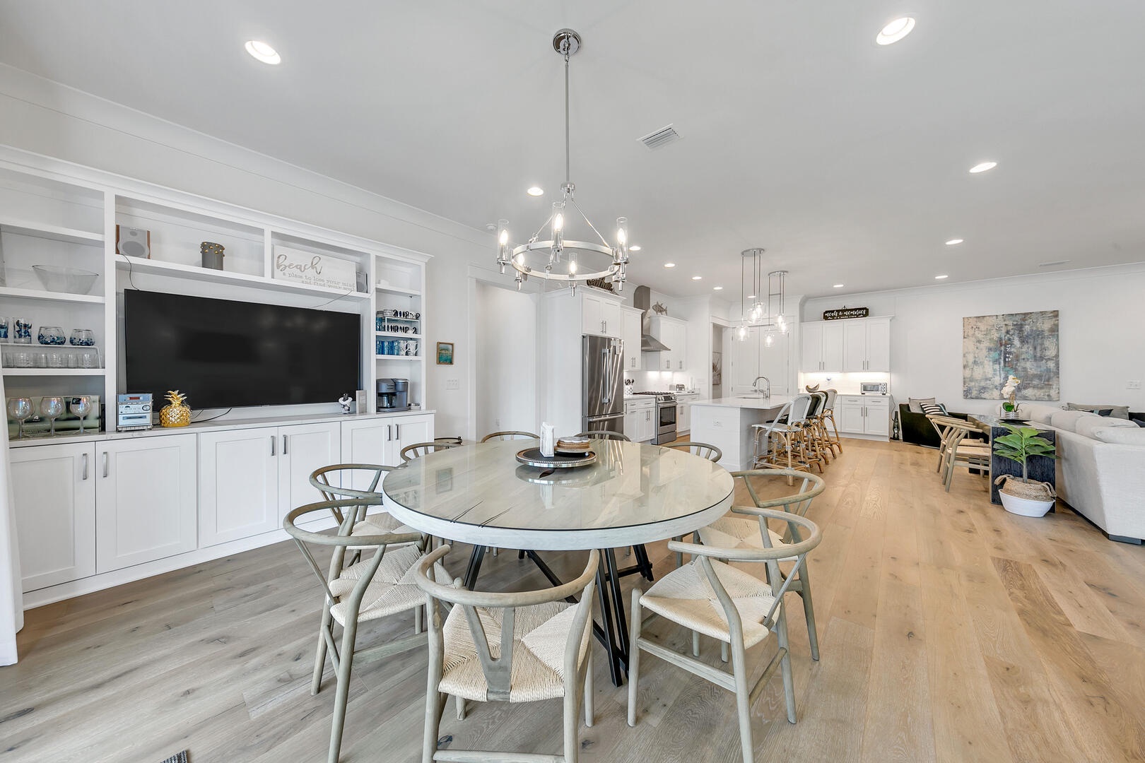 The main living space features an open-plan kitchen-living-dining area. You'll find a large living room with plush, wraparound sofa and huge flat screen TV for movie nights! There's a second sitting area with additional flat screen, and a nicely outfitted dining space as well! Additional seating can be found at the breakfast bar, or the outdoor bistro table. The kitchen is large, bright, modern and adorned with coastal contemporary finishes. You'll find every drawer and cabinet well-equipped with everything you could want for preparing wonderful family meals!