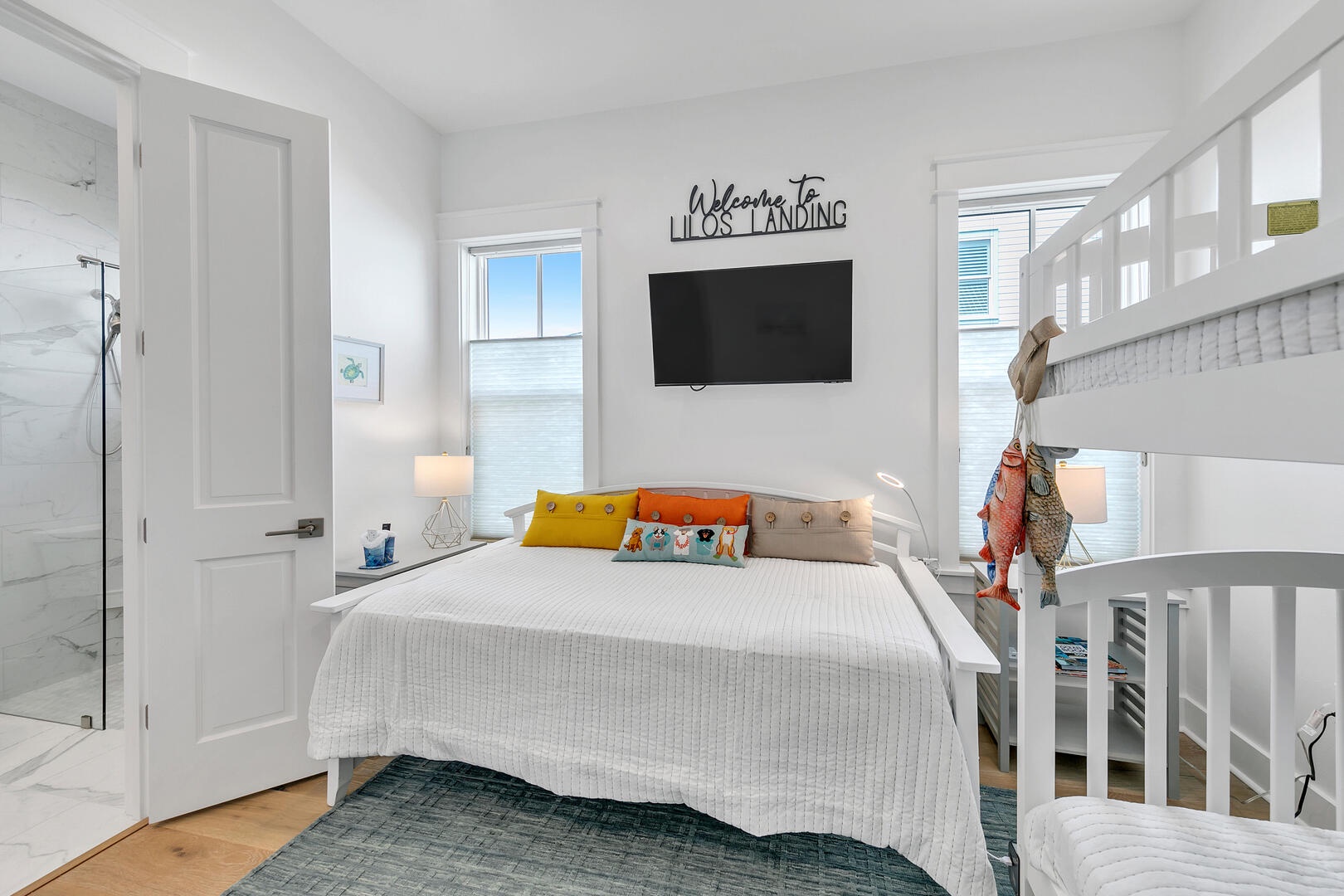 The queen bedroom includes a queen size bed, flat screen TV and a private bathroom. The bunk room also includes a private bathroom, and features a twin bunk as well as daybed with trundle!