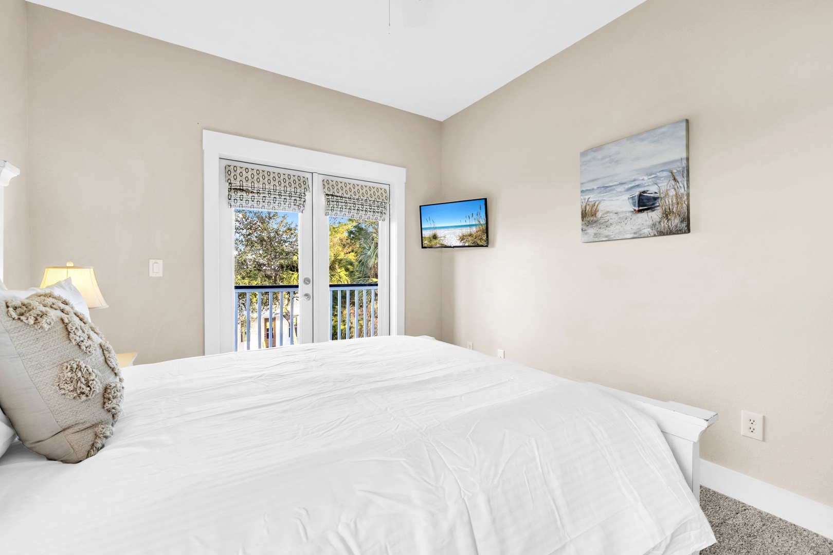 The 2nd floor queen bedroom with crisp linens, charming beach decor, and French doors opening to the balcony.