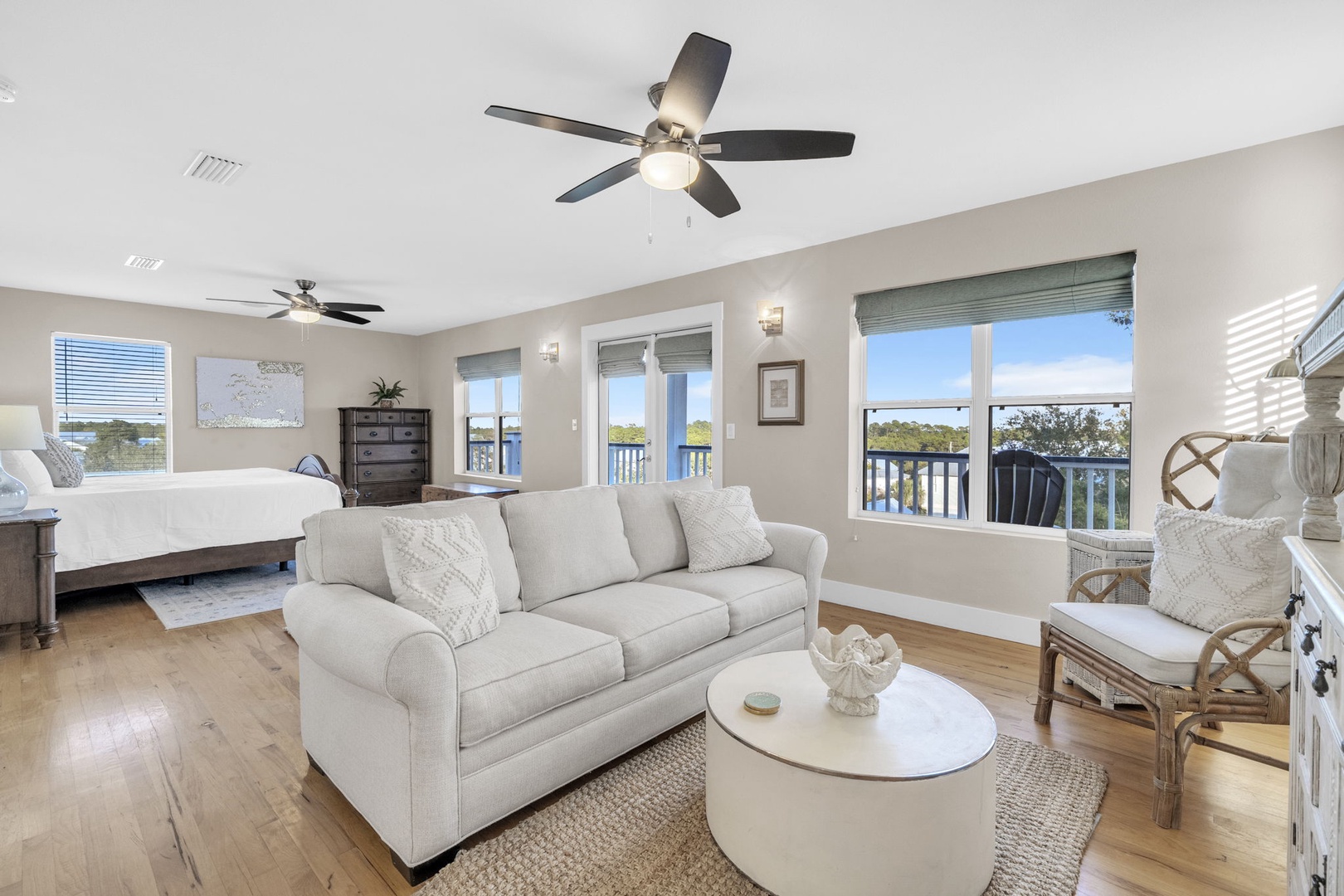 Relax in your spacious master suite with plush seating, ceiling fans, and a cozy bed—everything you need for the perfect getaway.