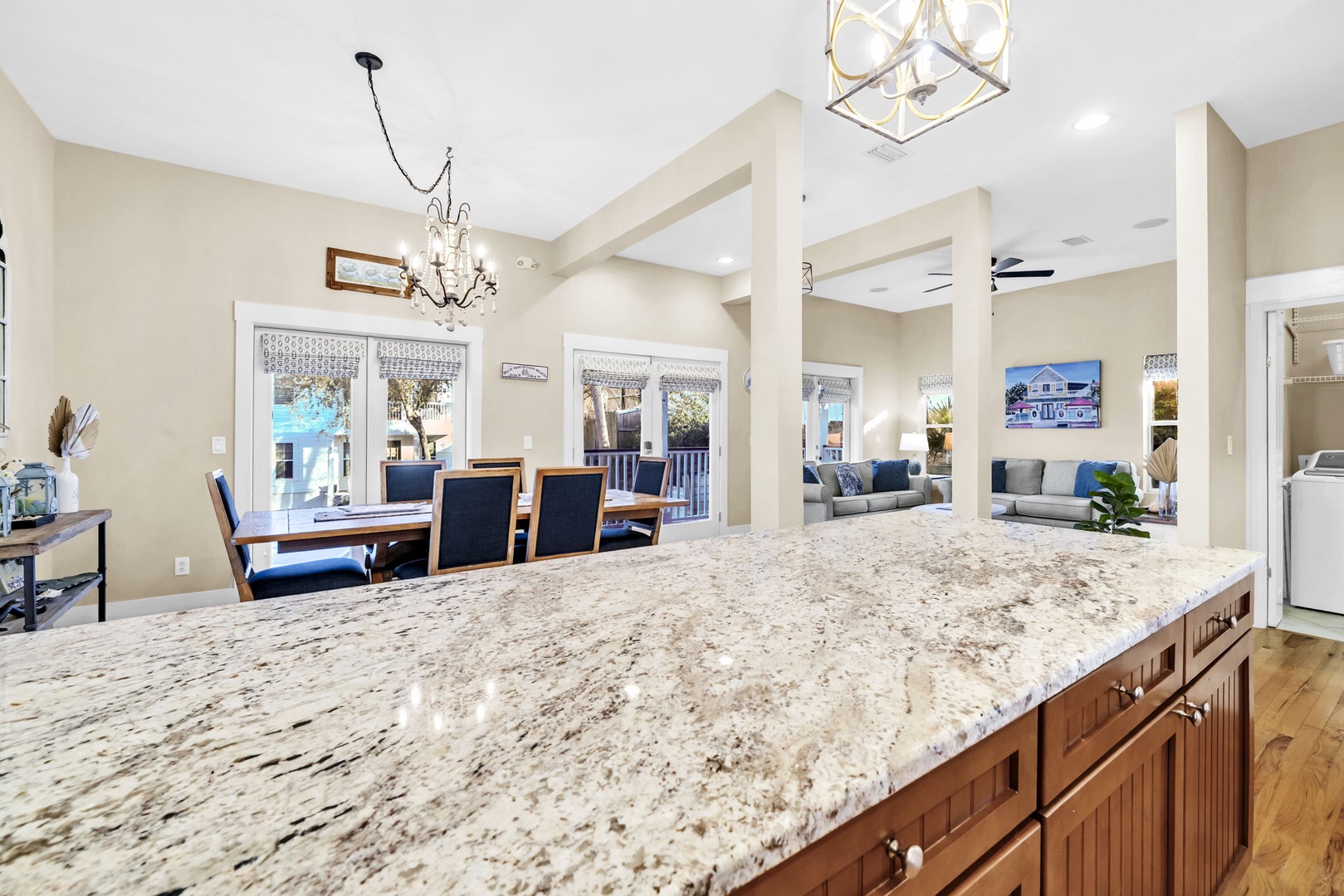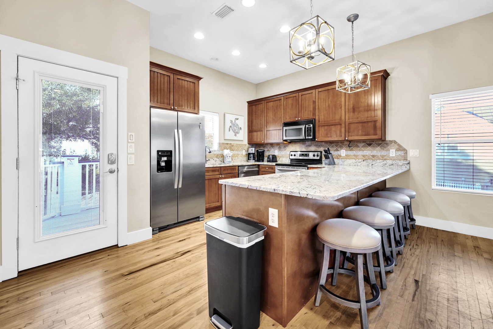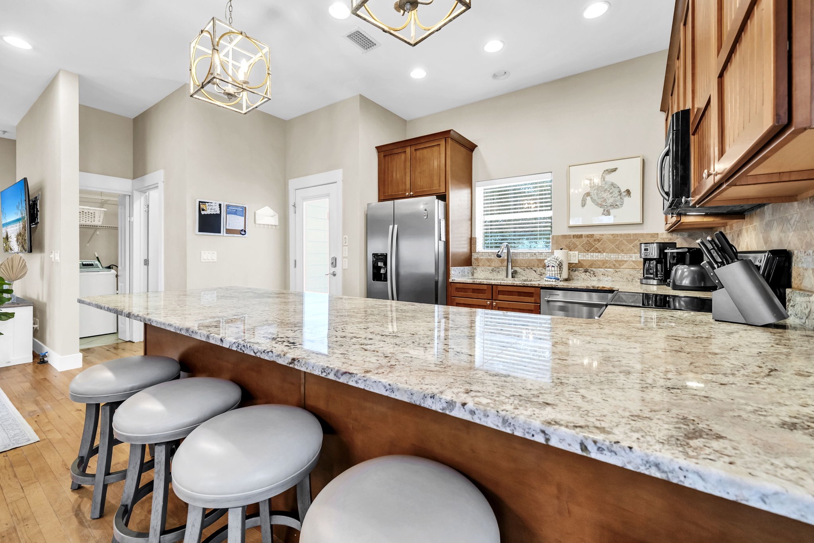Your fully equipped kitchen features gleaming granite countertops, modern appliances, and a spacious island with seating for memorable meals together.