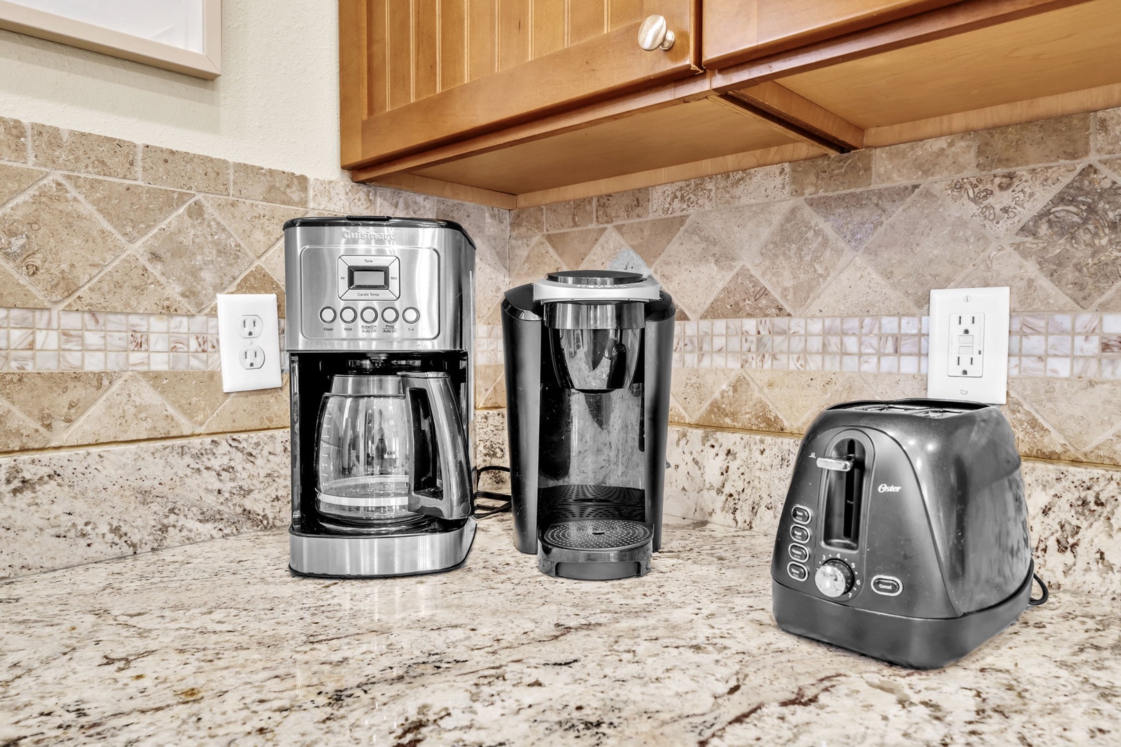 Start your mornings perfectly with premium coffee makers and toaster at your fingertips in this beautifully appointed kitchen.
