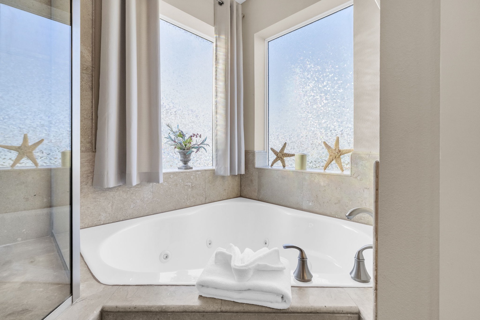 Soak in your private soaking tub surrounded by ocean-inspired decor and natural light streaming through corner windows.