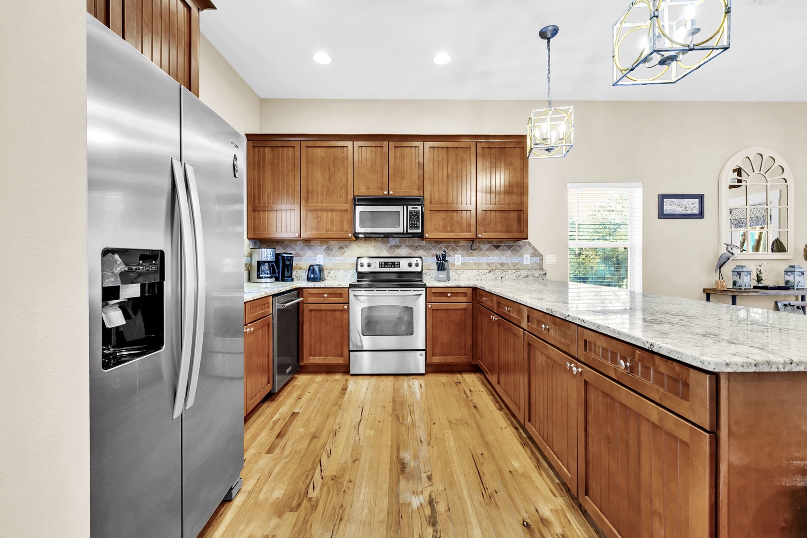 Your fully equipped kitchen features warm wood cabinets, granite counters, and stainless appliances for effortless meal prep.