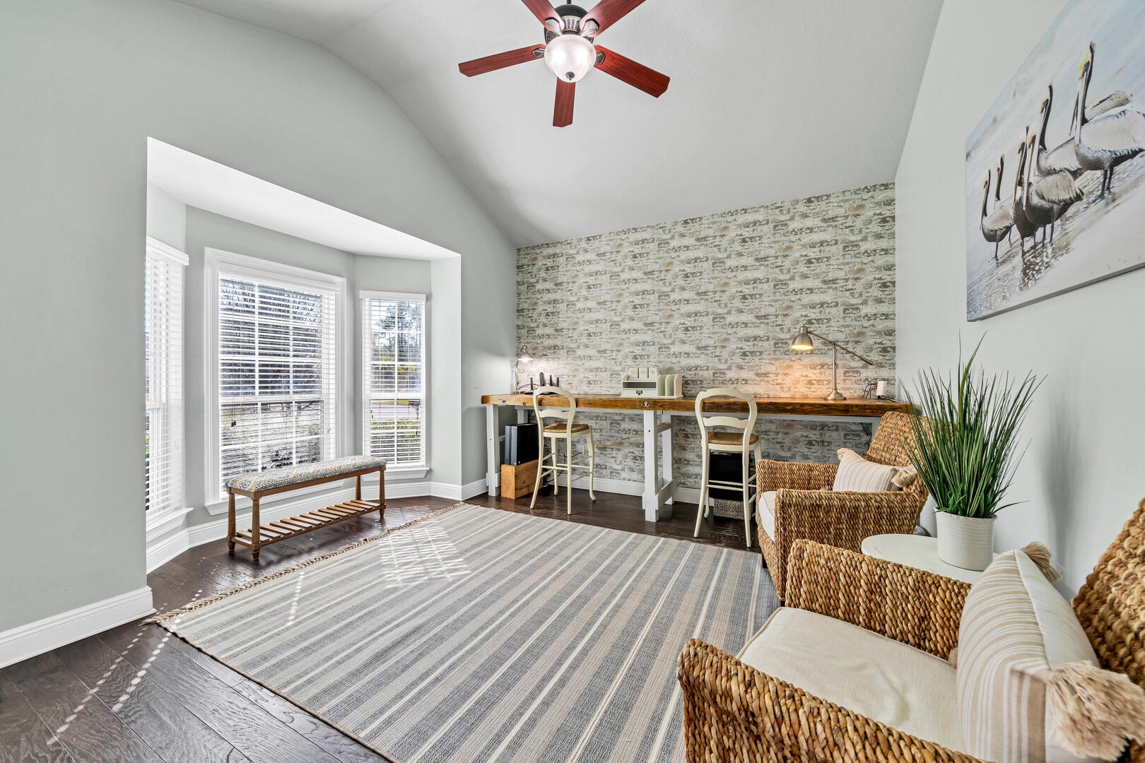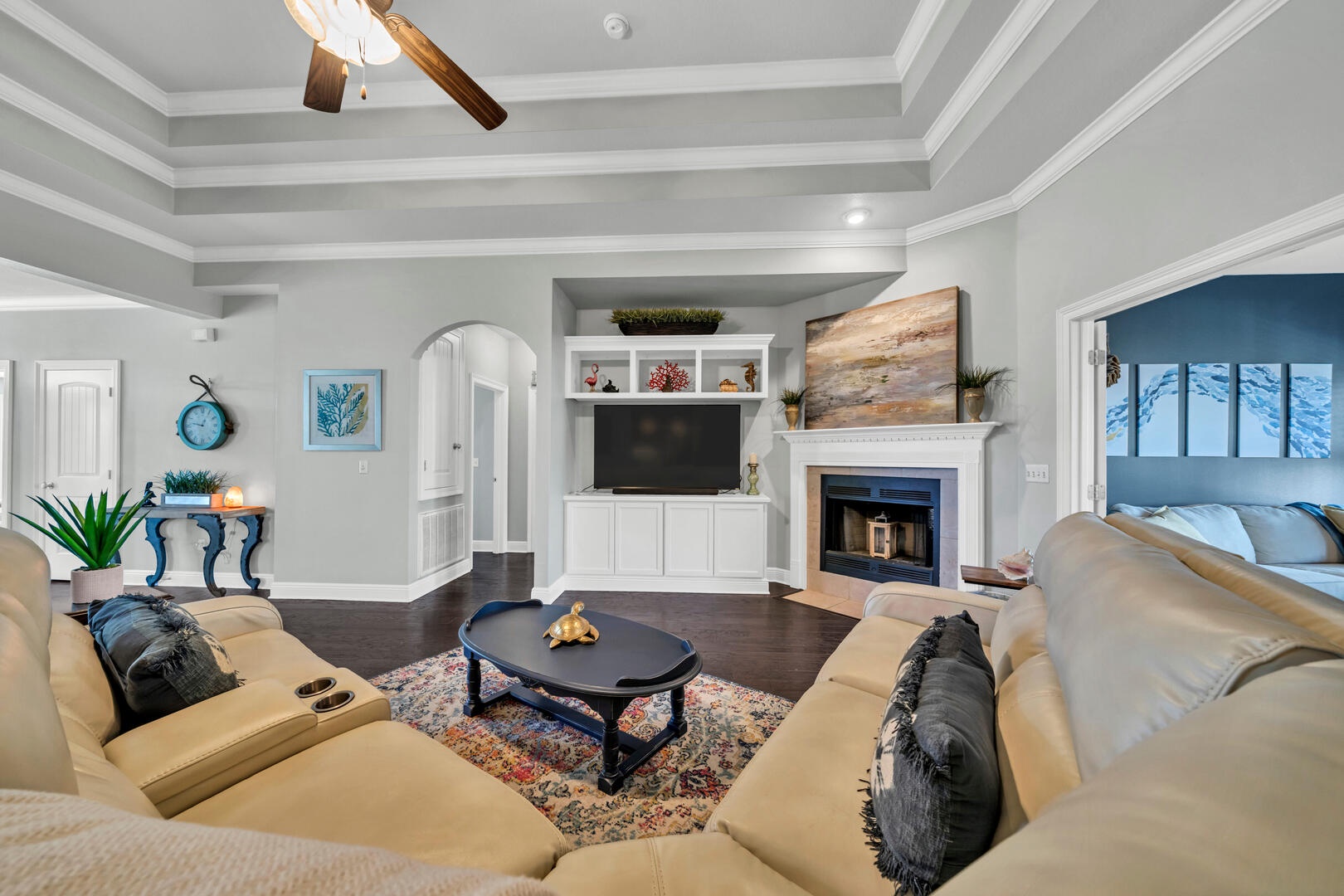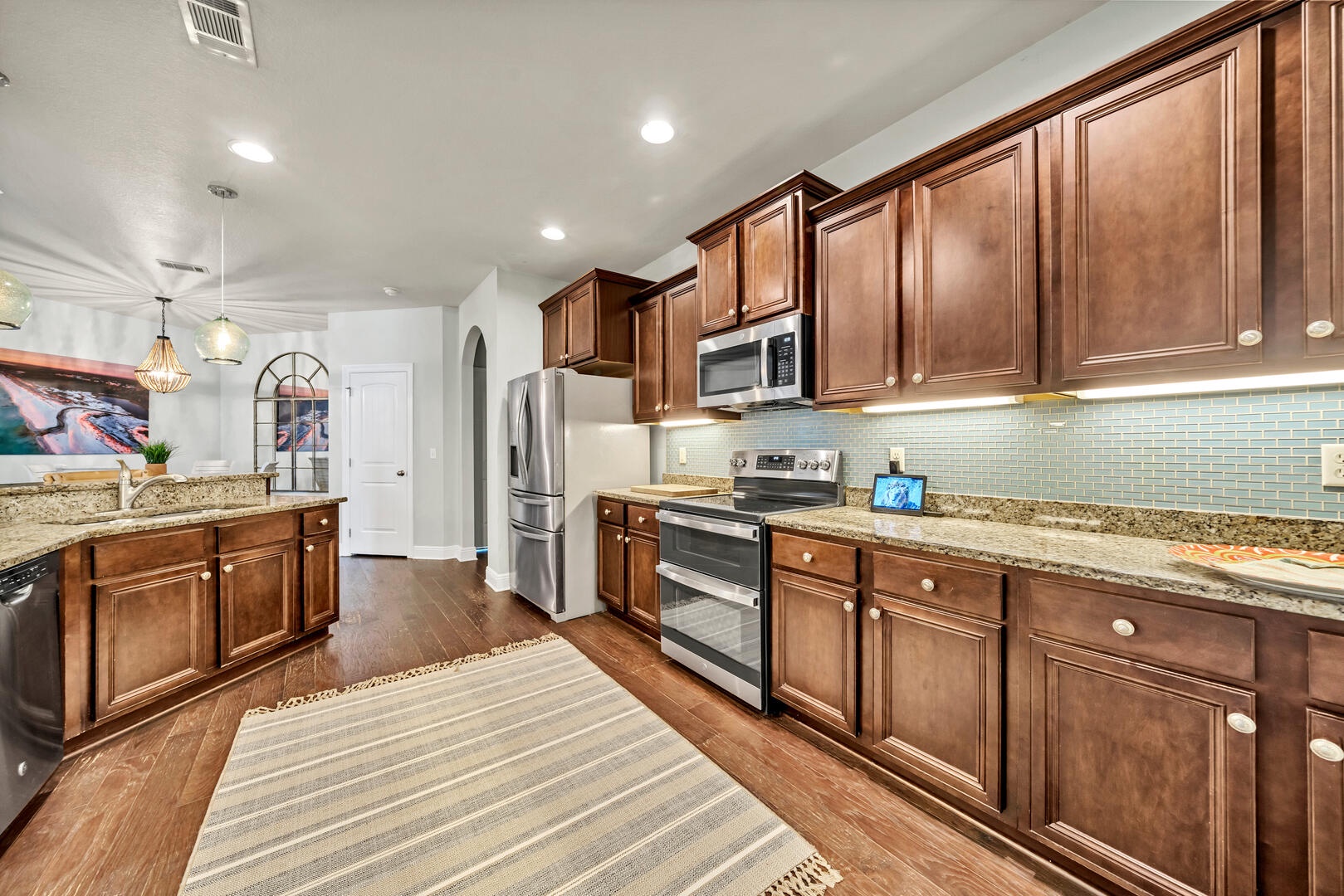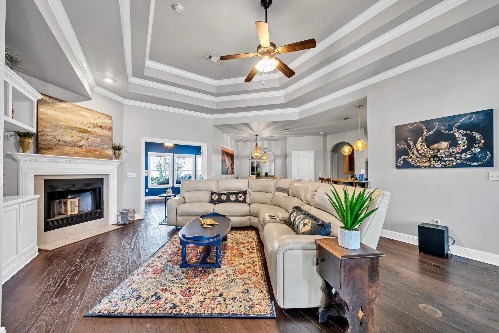 The home is tastefully decorated and features a large open plan kitchen-living-dining area. The living room area features seating for the whole family, with a large flat screen TV offering a great place for entertaining and relaxing. Plentiful seating and spaces to relax - including a sunroom with foosball, backyard patio with fire pit, and reading room with dedicated laptop workspaces!