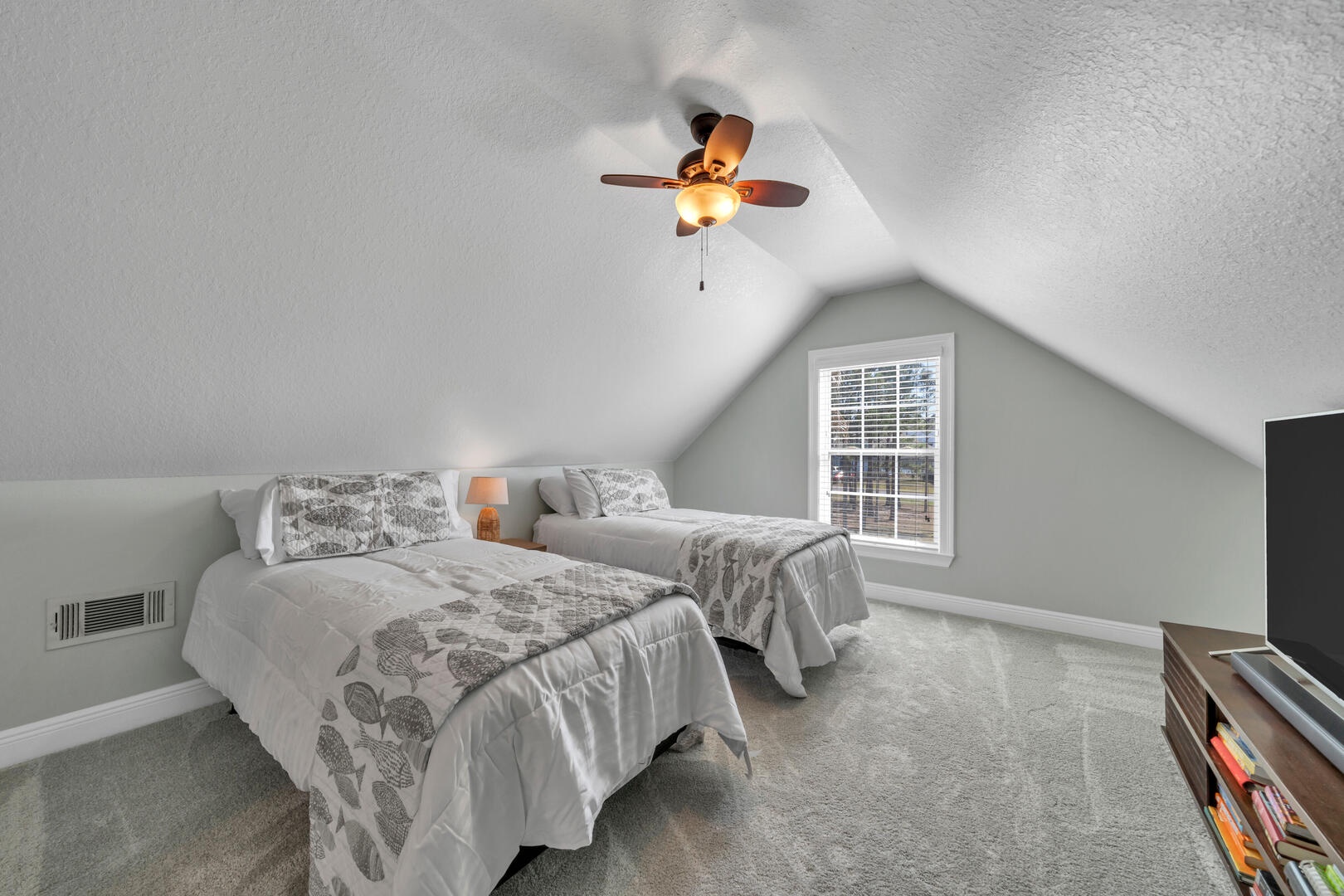The loft bedroom features two twin beds and a flat screen TV!