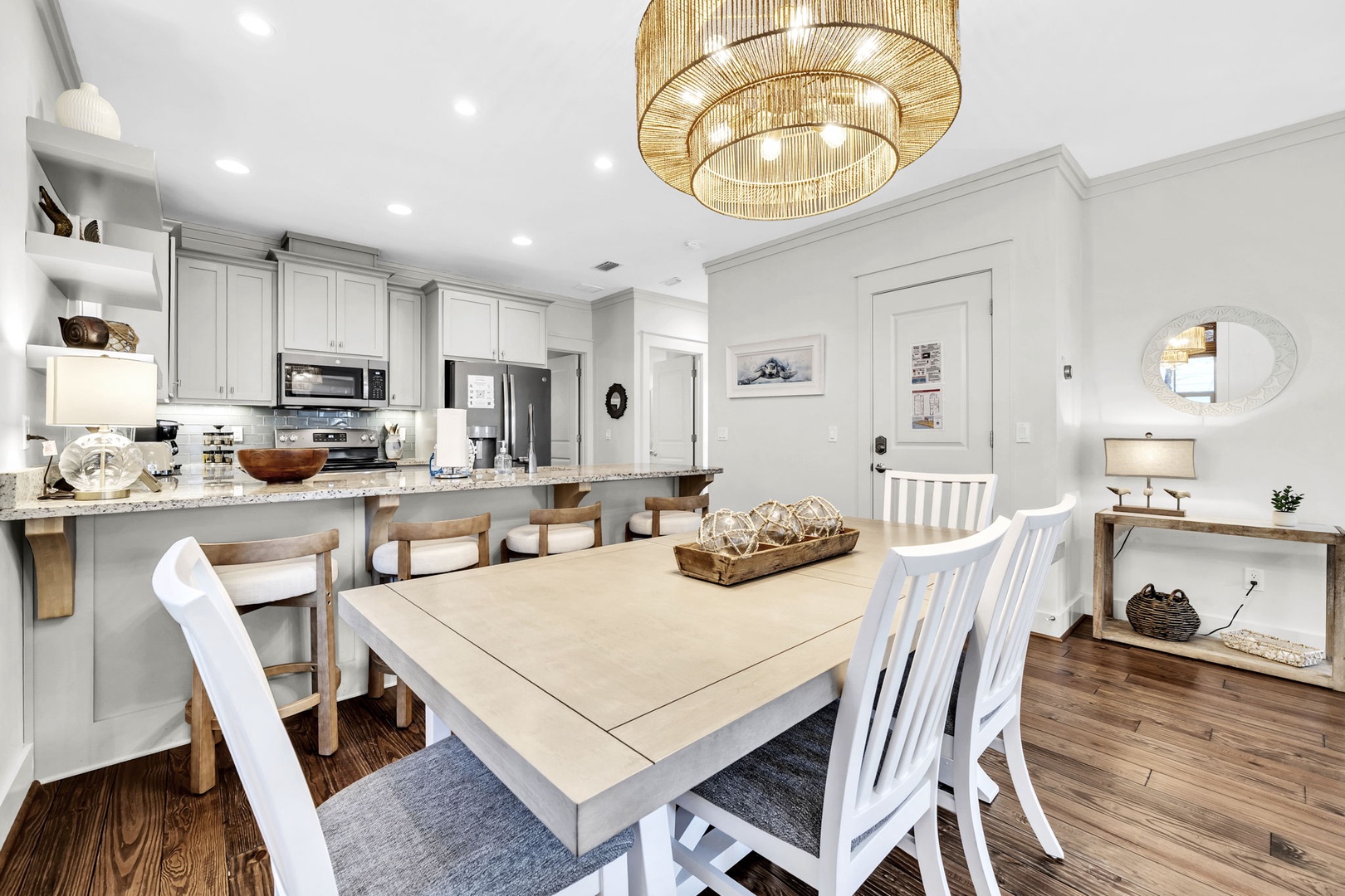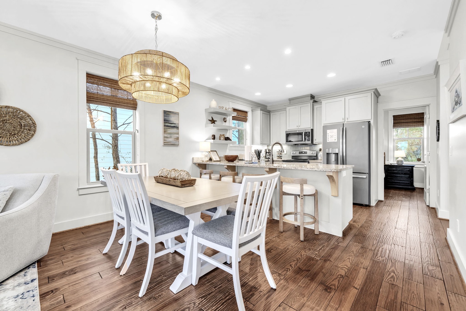 Your open-plan kitchen flows seamlessly into the dining area, where coastal charm meets modern comfort under warm pendant lighting.