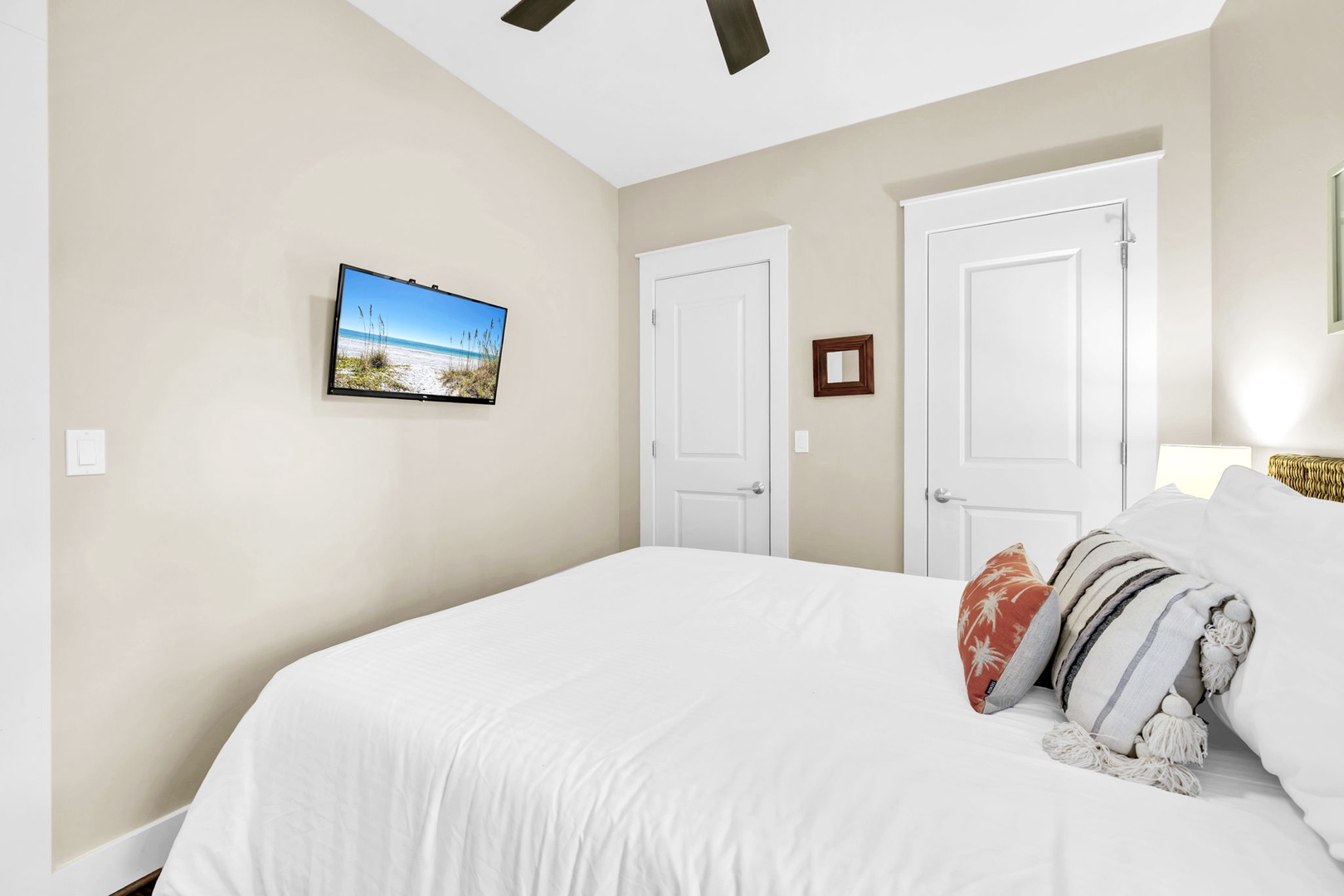 Sink into crisp white linens and enjoy your favorite shows on the flat-screen TV while the ceiling fan keeps you perfectly cool.