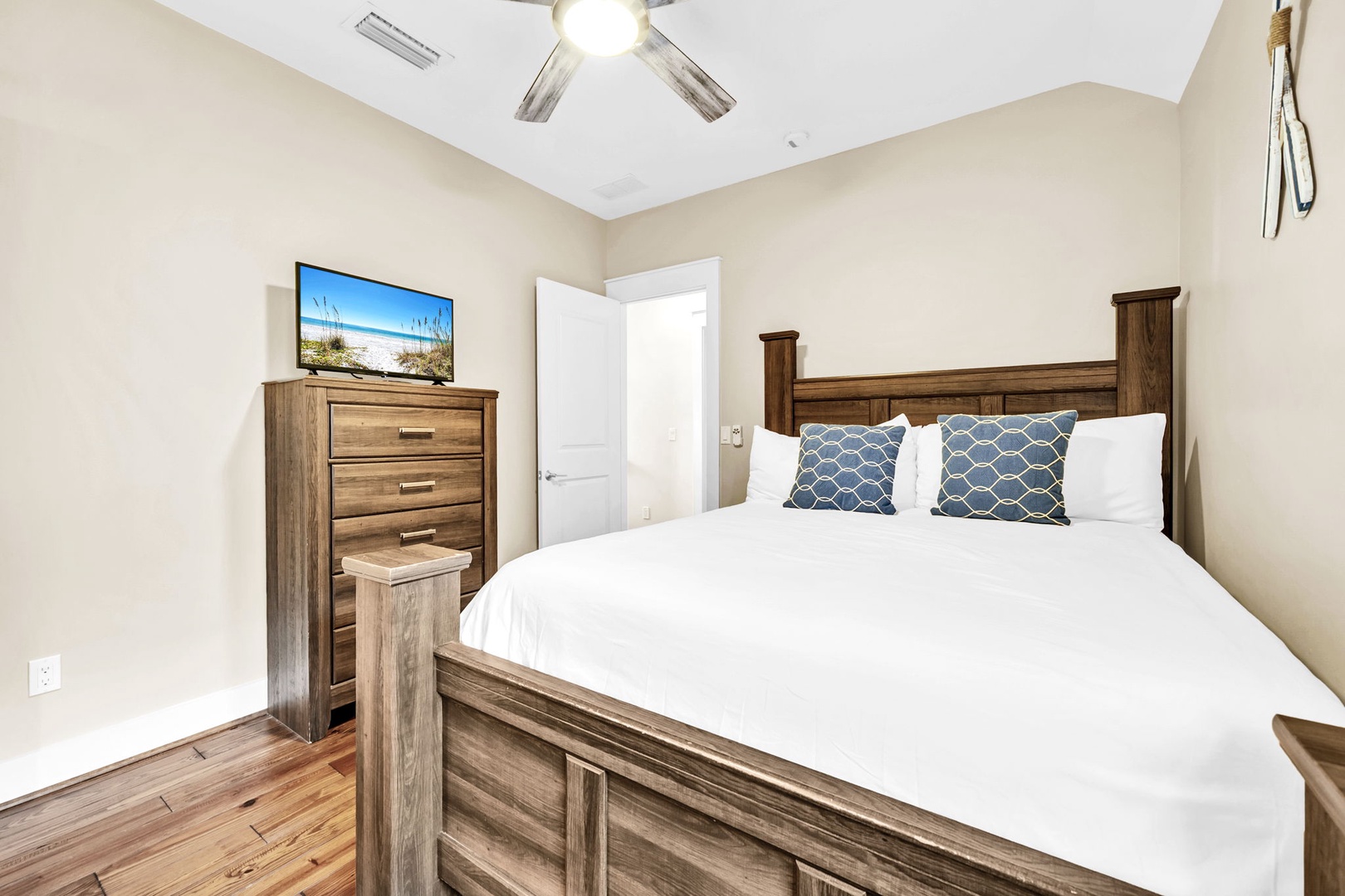 Sink into crisp white linens in your serene bedroom, where warm wood floors and a gentle ceiling fan create the perfect retreat.