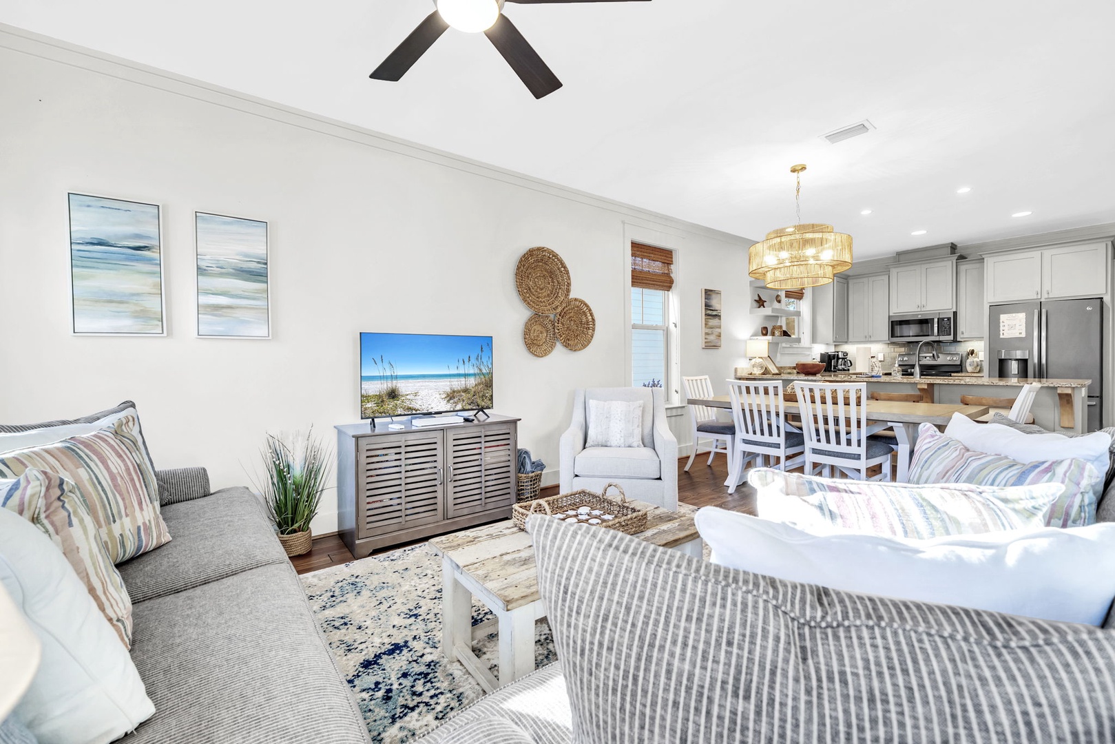 Relax in your coastal-inspired living space with plush seating, beach artwork, and open kitchen - perfect for unwinding after beach days.