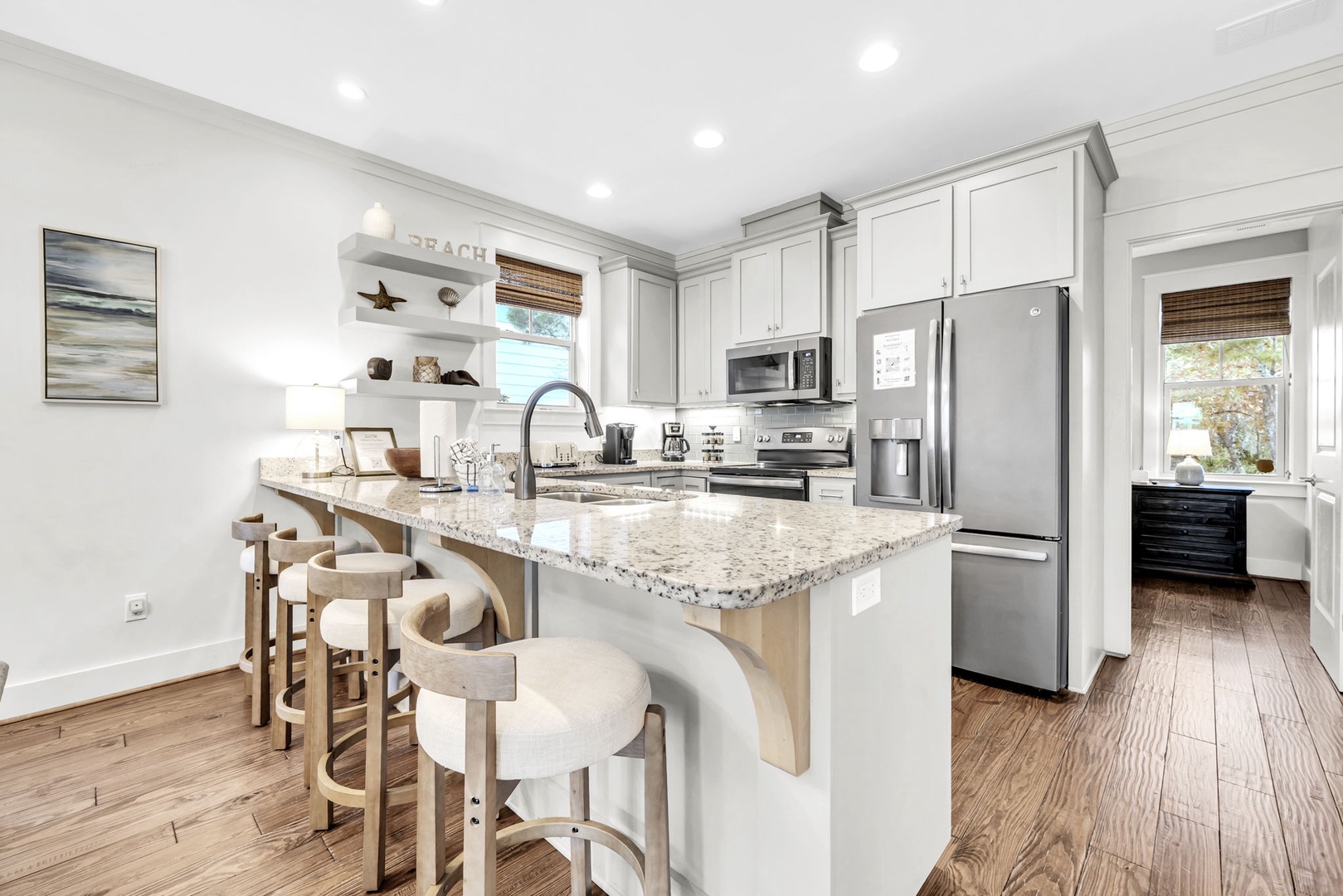 Your spacious kitchen features granite countertops, stainless steel appliances, and a breakfast bar where you can enjoy morning coffee with coastal charm.