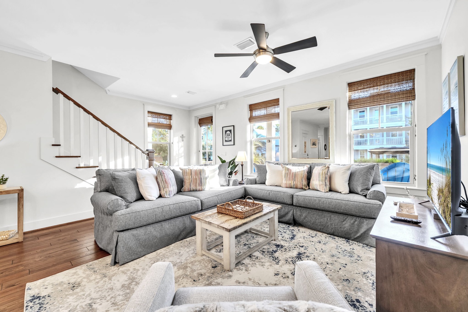 Sink into plush seating and unwind in your bright, beautifully designed living room with coastal touches and modern comfort.
